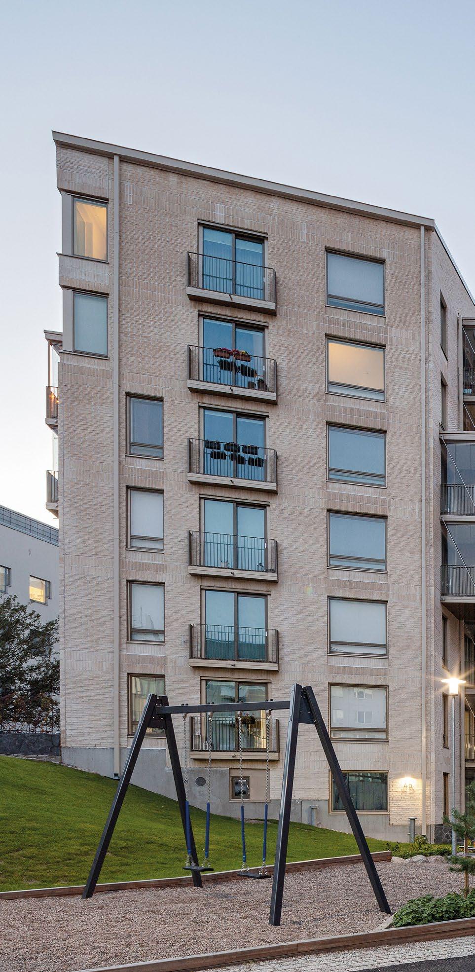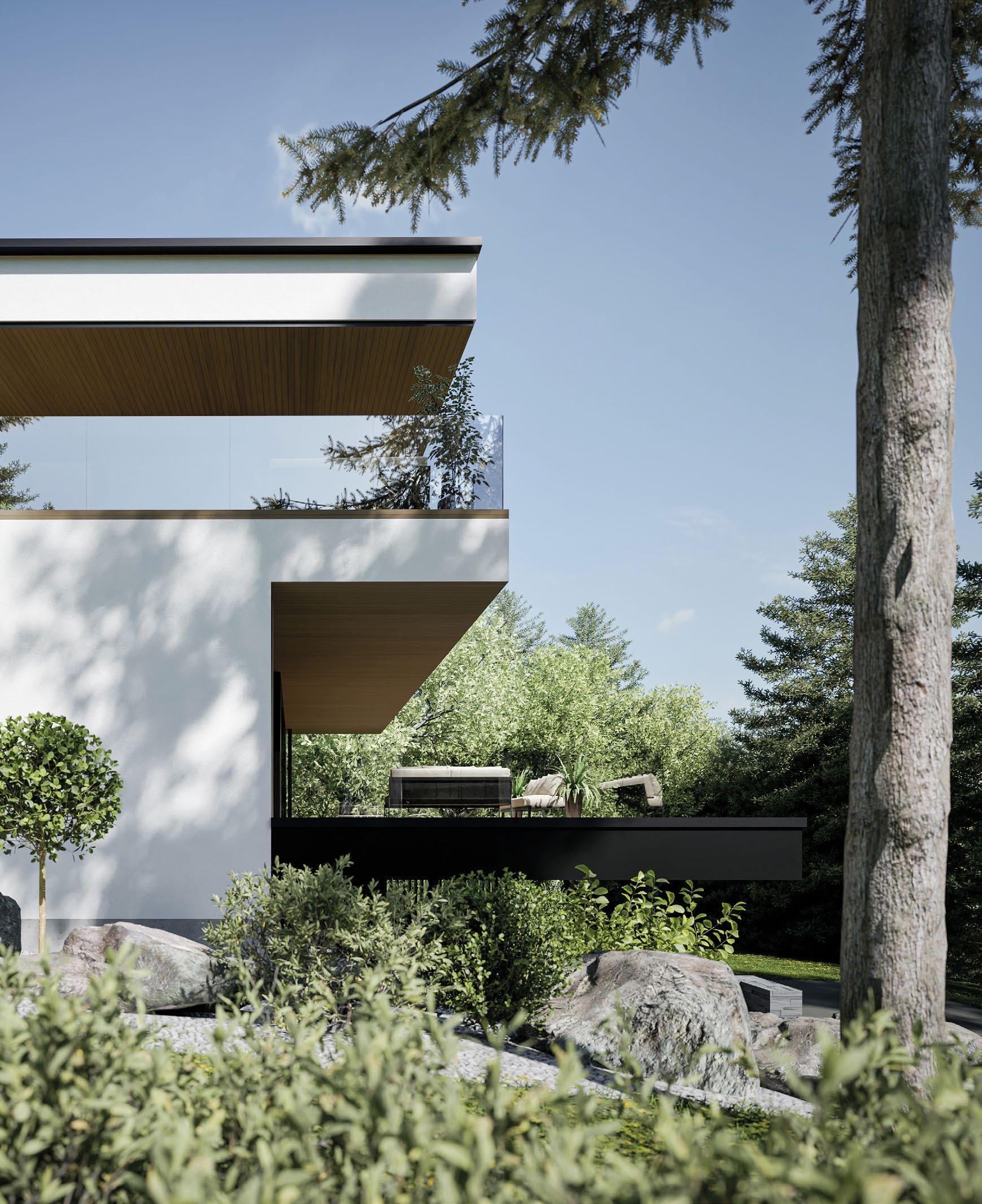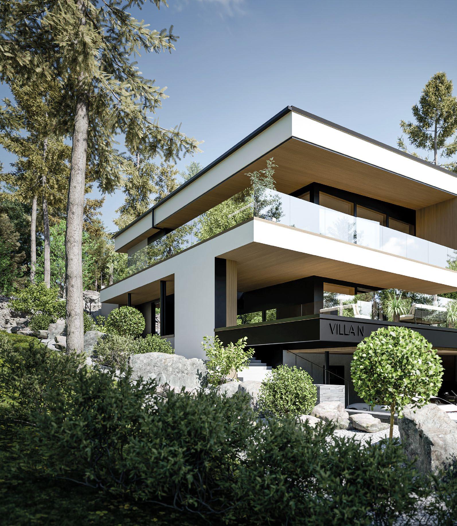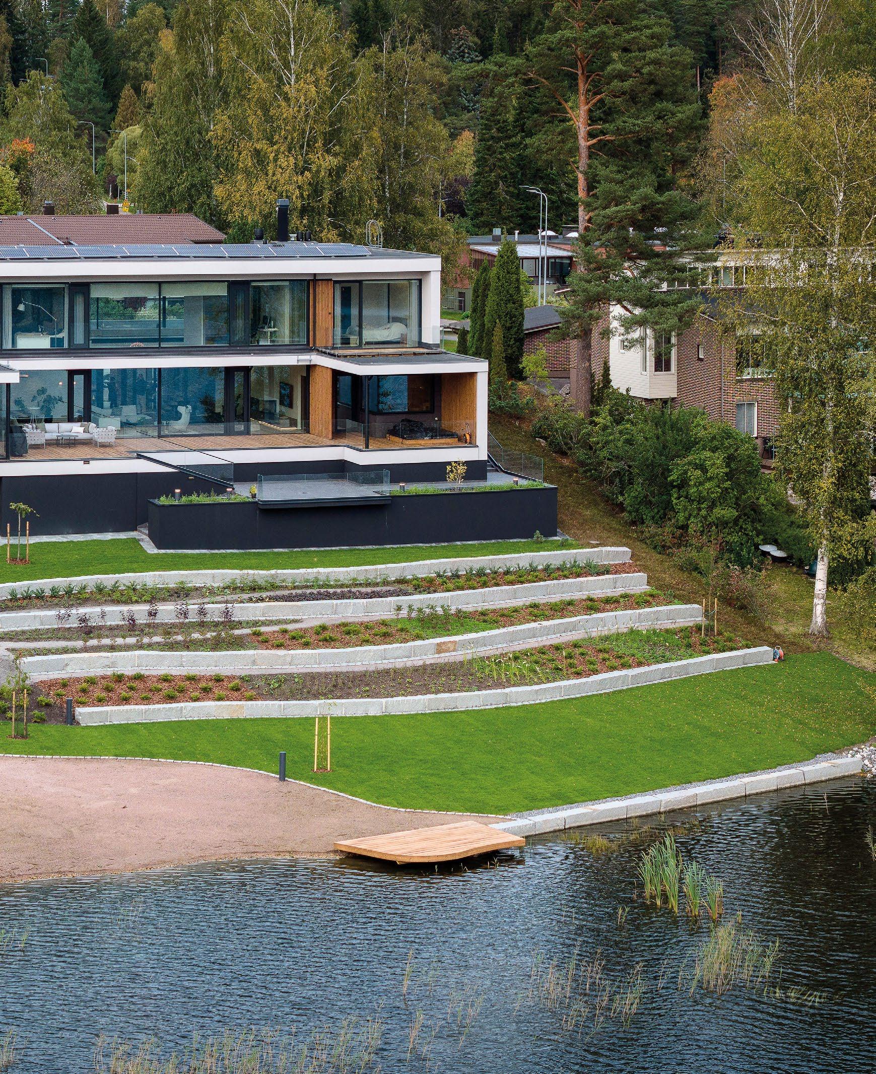 sin kautta suoraan luontoon jossa sijaitsee hieno koskematon kallioluonto ja puistoalue. Rakennuksen spa-osasto ja tunnelmallinen takkahuone avautuu kallio luontomaisemaan joiden edessä oleva terassialue yhdistää rakennuksen saumattomasti kallioon kalliota mukaillen. Ylimmässä kerroksessa olevat olohuone, ruokailutila ja keittiö avautuvat suurten lasipintojen kautta alarinteen suuntaan avaten näkymät koko asuinalueen yli. Oleskelutiloja ympäröivät terassit jotka antavat näkösuojaa kadulle, mutta mahdollistavat asukkaiden nauttia näkymistä myös ulkotilojen kautta. Oleskelutiloja ja terasseja löytyy aina päivän kulun mukaan eri ilmansuuntiin.