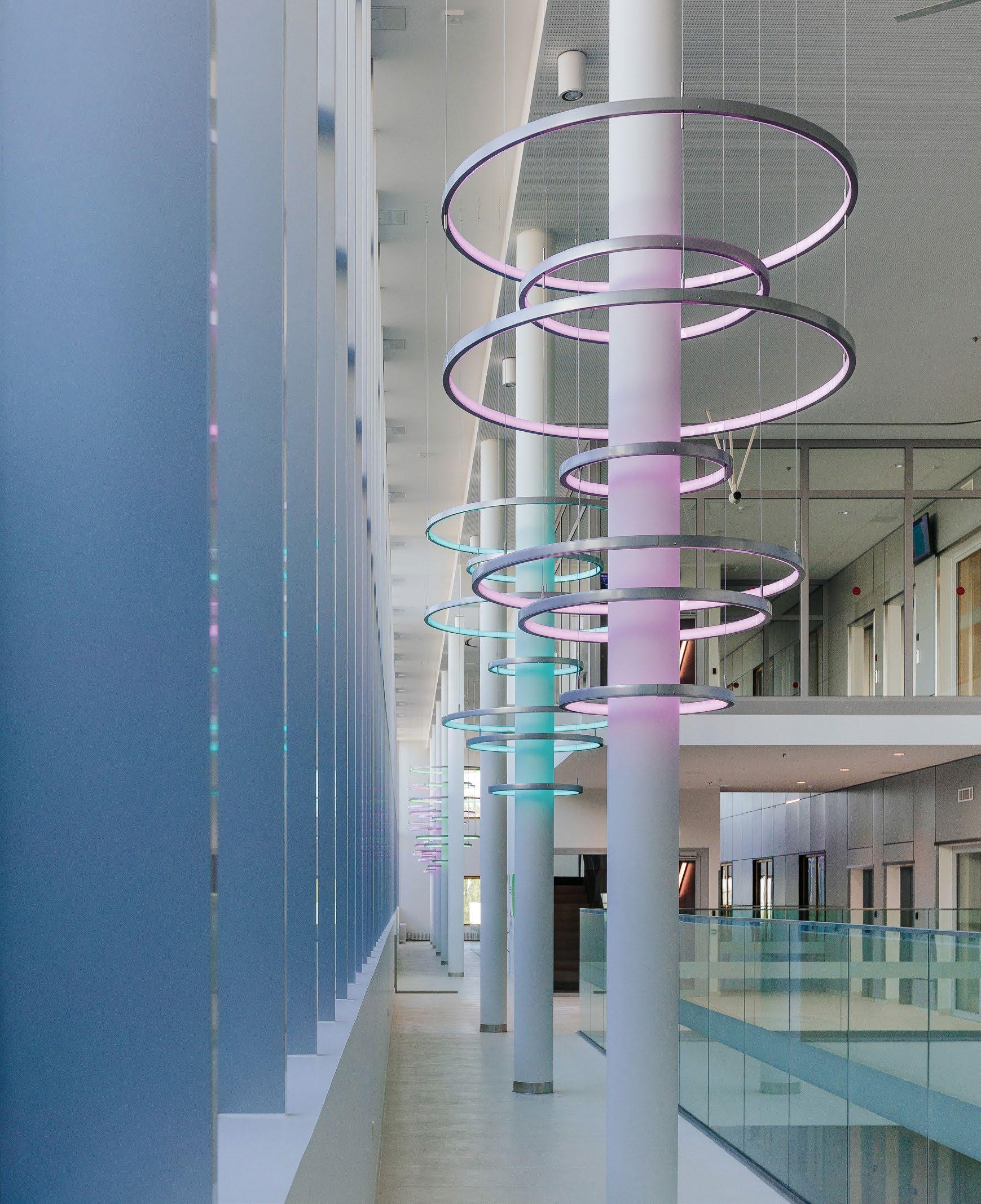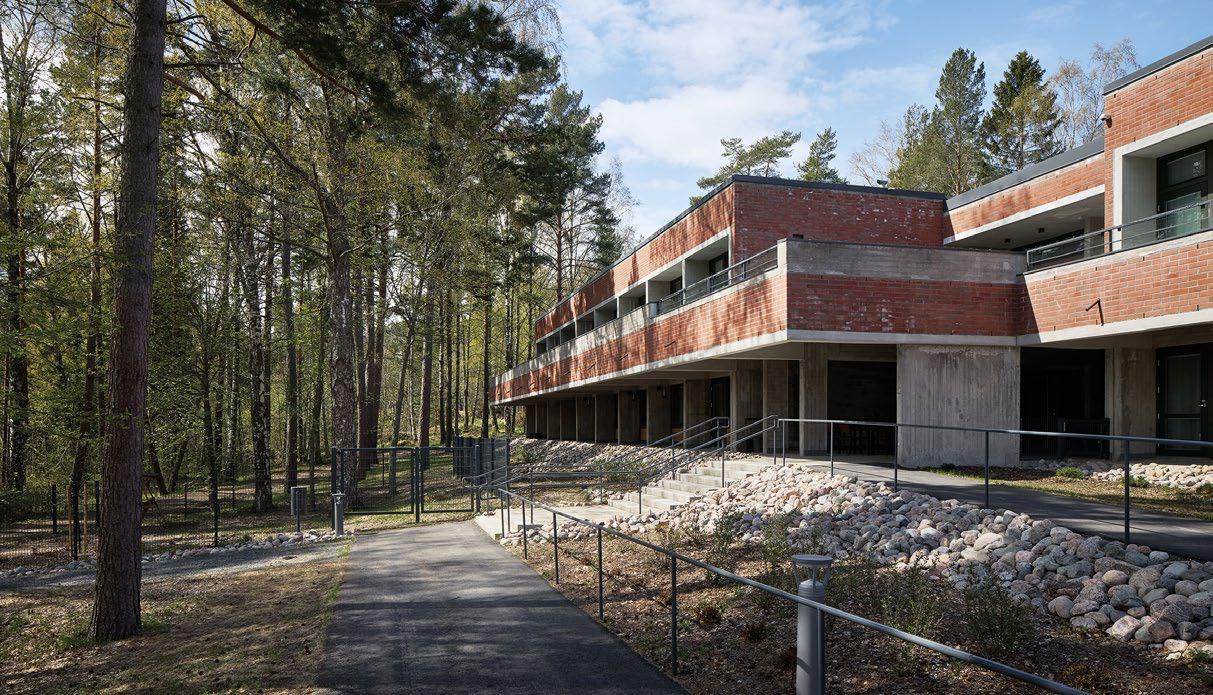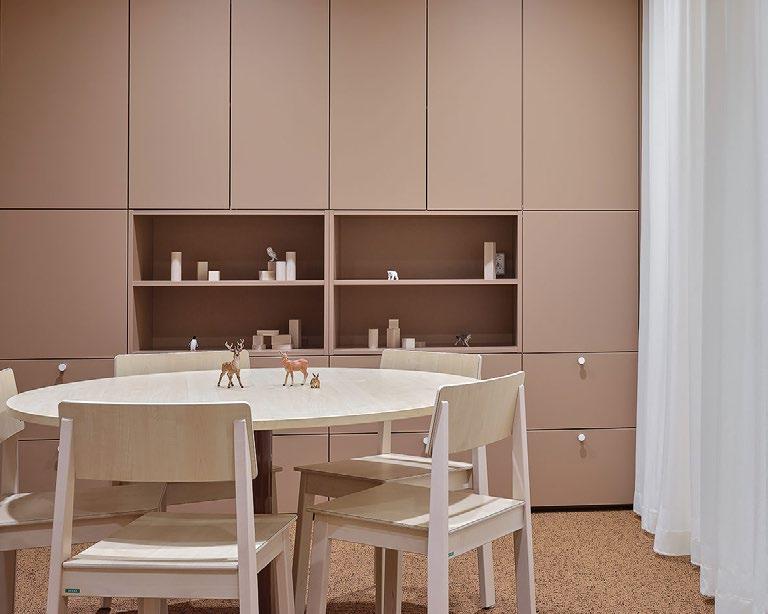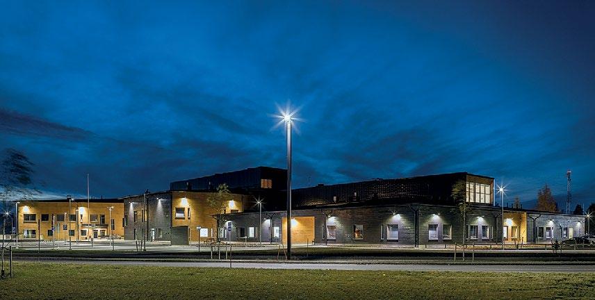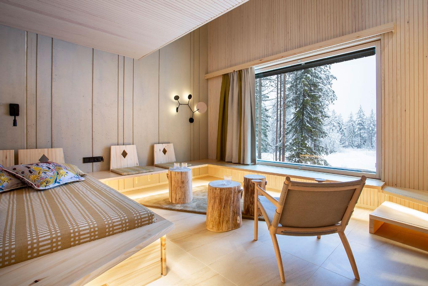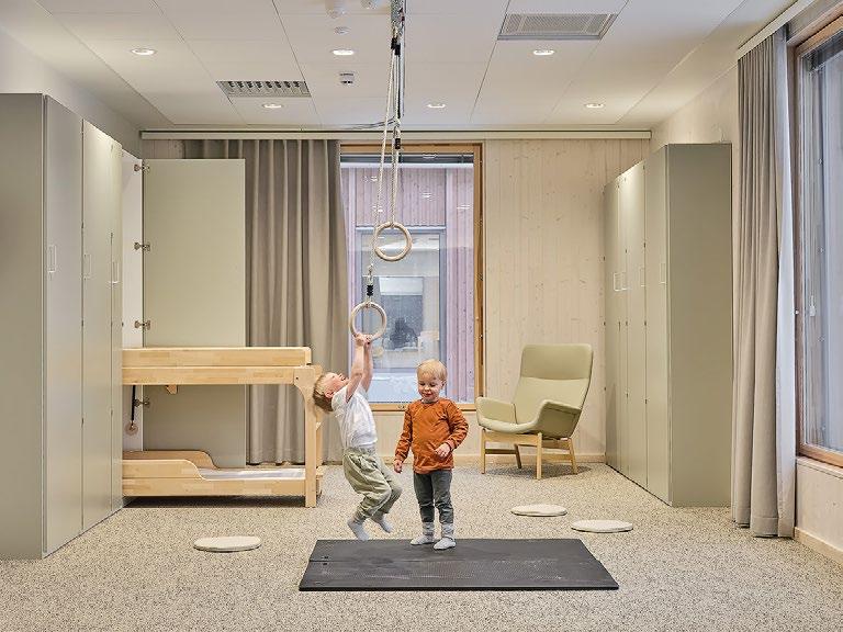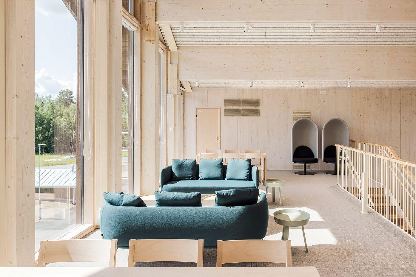 not avautuvat kutsuvasti ulospäin. Pudasjärven kaunis luonto ja sen eri vuodenajat inspiroivat sisustussuunnittelua. Hirsi- ja puupinnat ovat oleellinen elementti rakennuksessa. Niiden rinnalle on lisätty luonnosta inspiroituneet kuviot ja puulle sopivat murretut sävyt, jotka luovat lämpimän ja hyvinvointia edistävän tunnelman. Suunnittelussa on tehty tiivistä yhteistyötä käyttäjien kanssa. Kohteeseen suunniteltiin käyttäjälähtöiset, räätälöidyt kalusteet ottaen erityisesti huomioon käytännöllisyys, esteettömyys ja estetiikka. Taide on näyttävästi esillä sisäänkäynnistä läpi rakennuksen. (02)