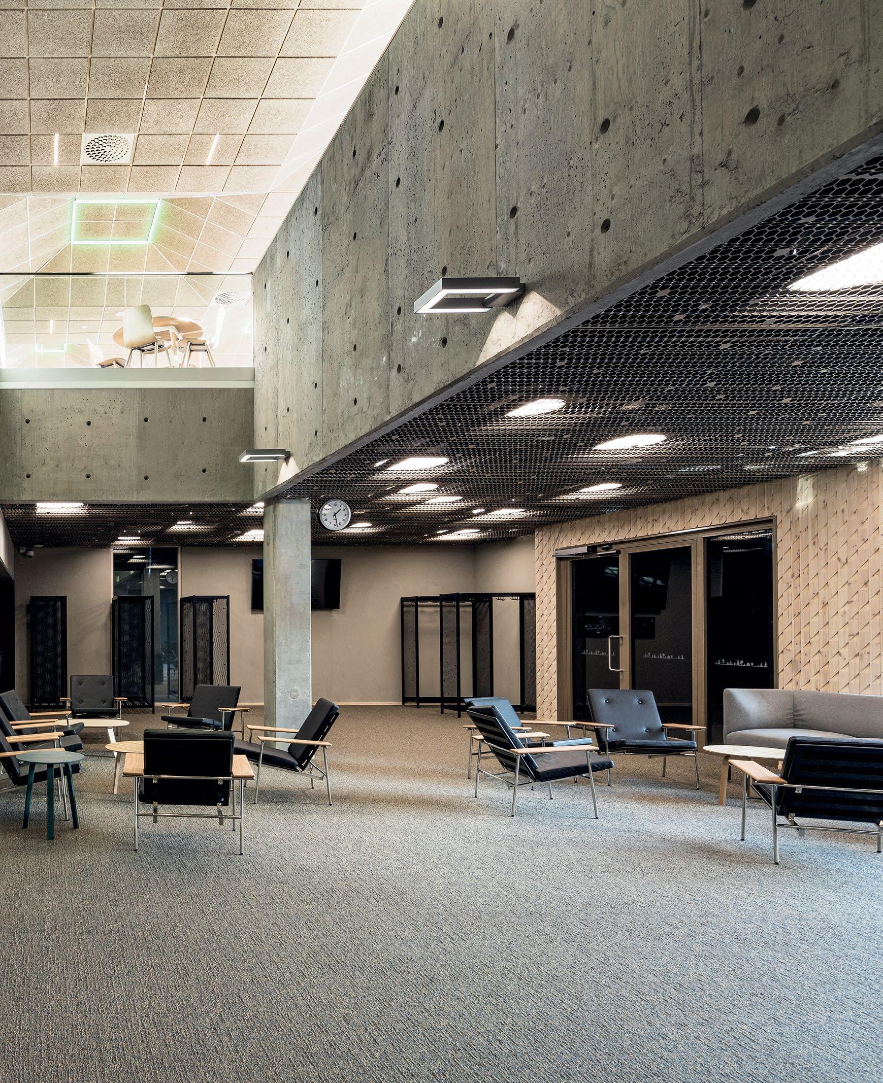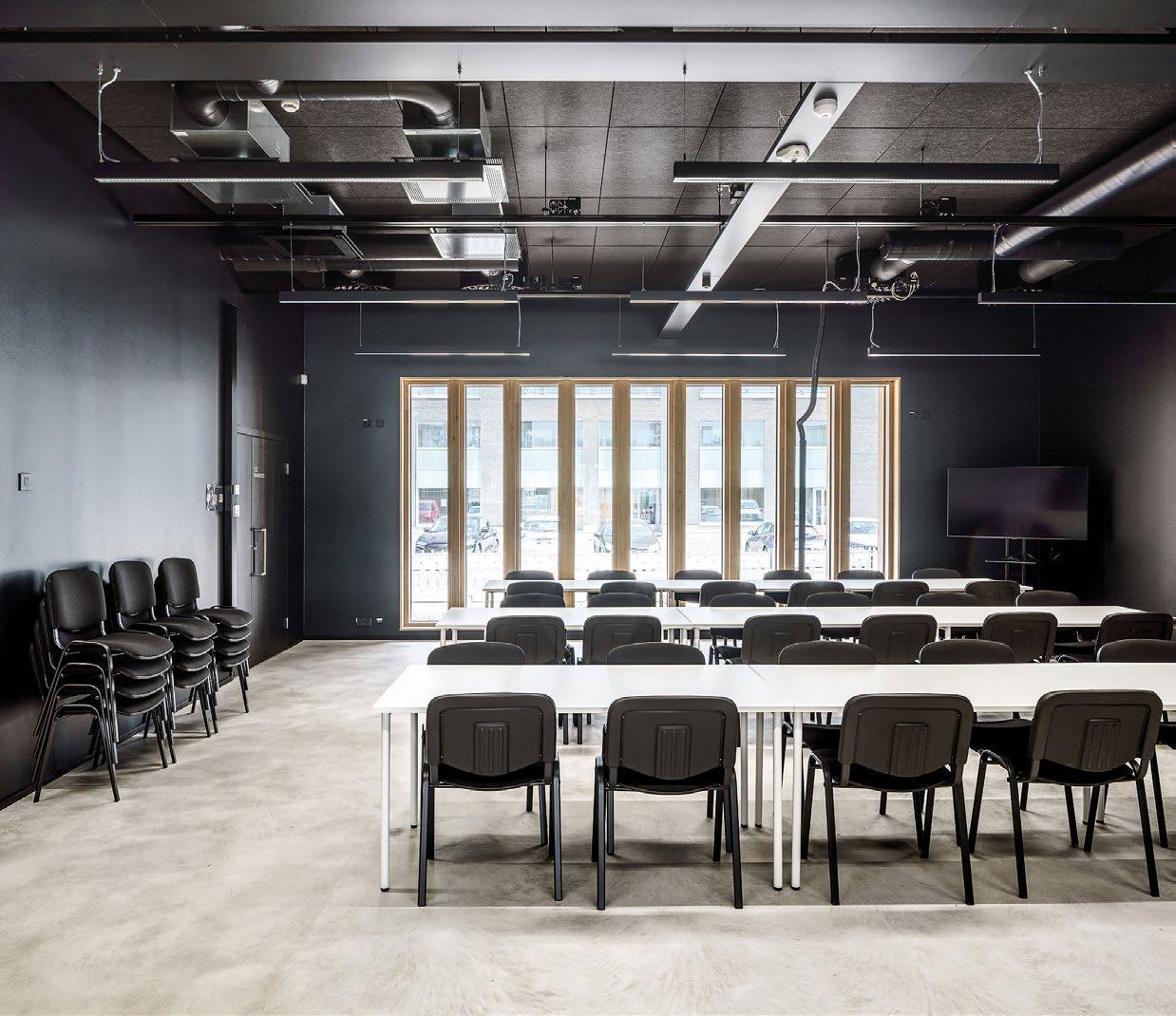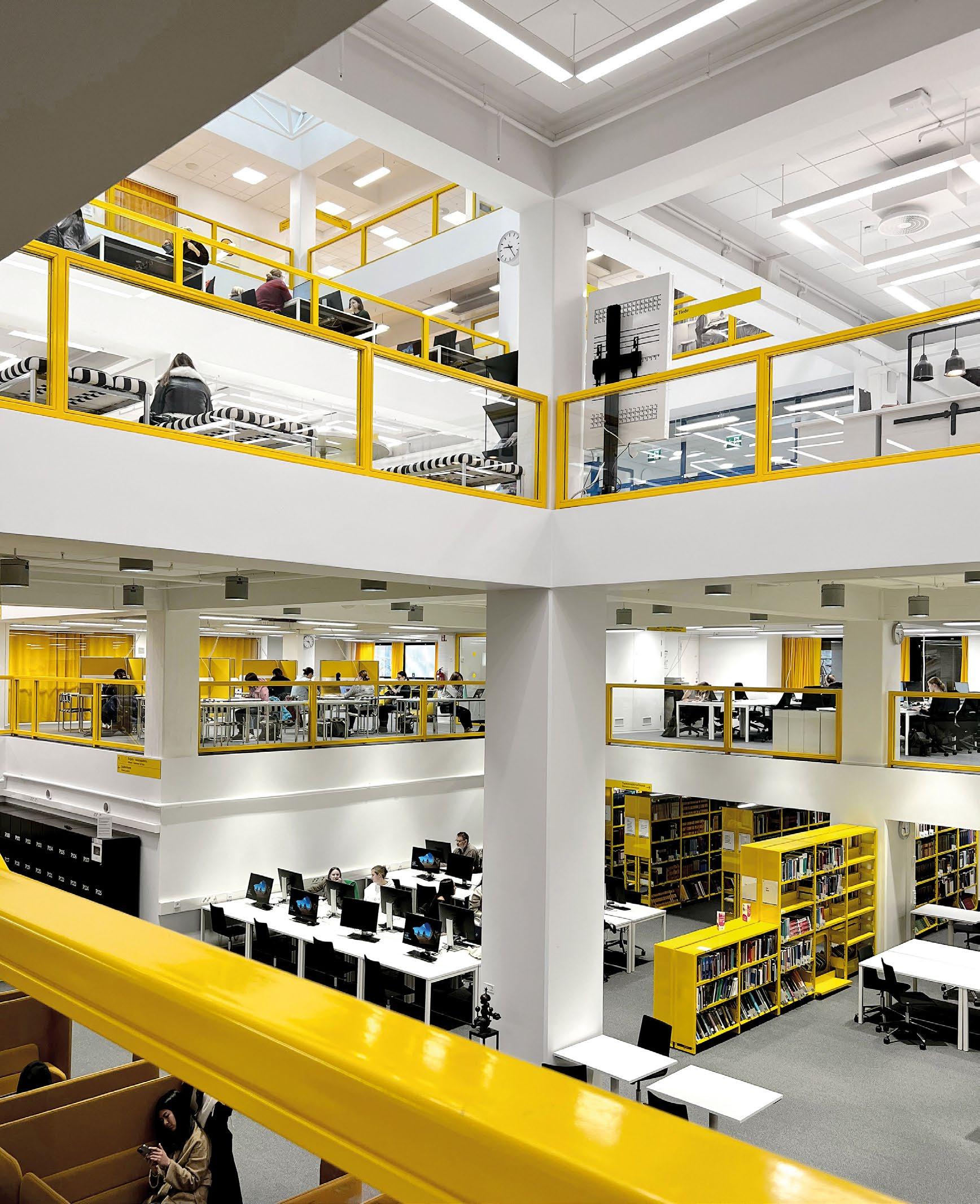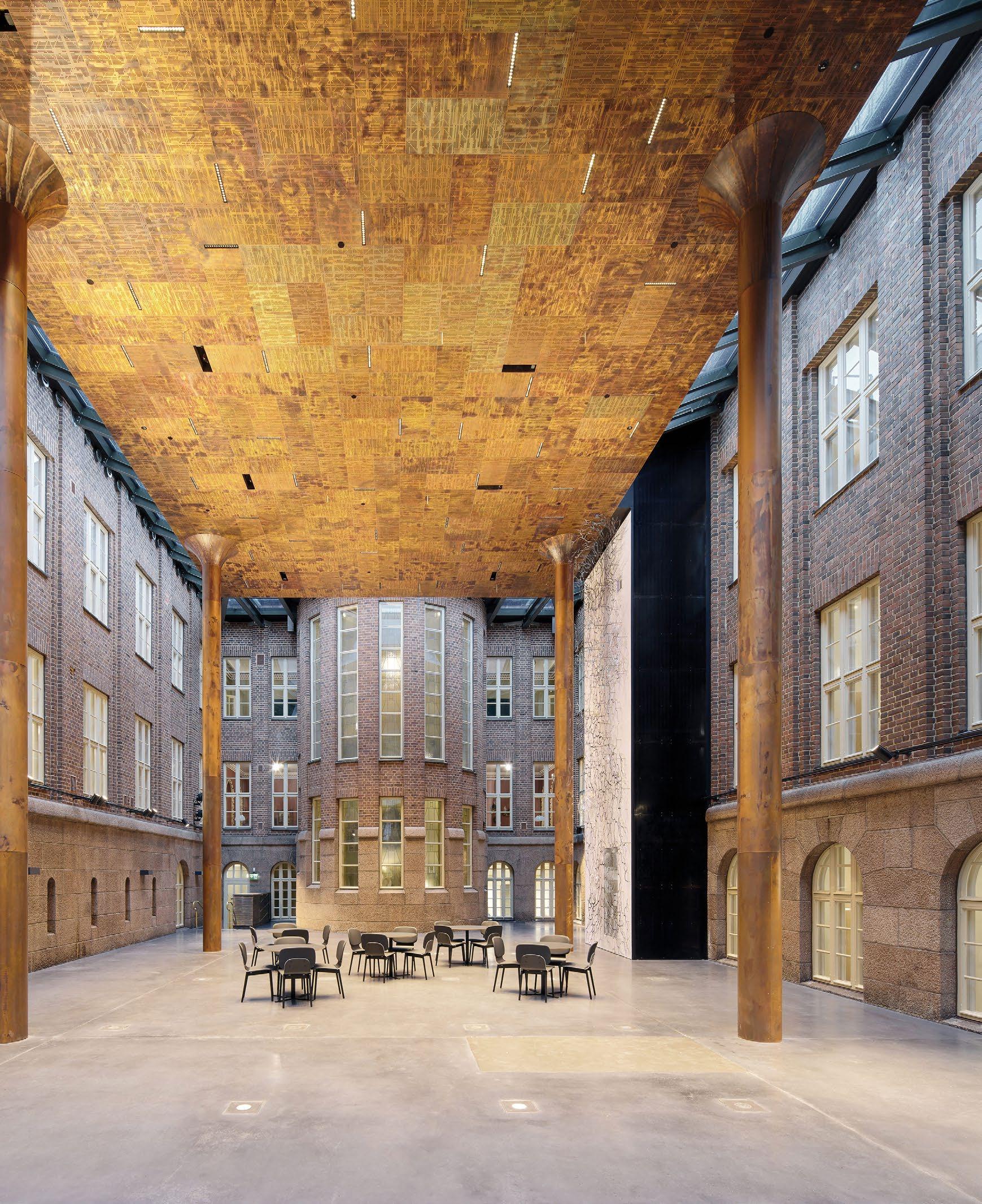 Vyöhykkeellisesti hierarkkisessa tilaratkaisussa avoimet ryhmätyöskentelyä painottavat oppimisympäristöt ovat aulan vierellä ja työrauhaa vaativat tilat kerroksen ulkoreunoilla. Katsomoportaissa näkyy kohteen sisustuksen keskeinen pari: puu ja betoni. Kovan ja rouhean betonin parina sisäpinnoissa on käytetty puuta monessa eri muodossa. Puun ja betonin lisäksi väripaletin peruselementtejä ovat puhdas valkoinen, dramaattinen musta ja metallinhohtoinen samppanjan sävy. Kirkkaampia tehostesävyjä on vain ripaus. Neutraali ja luonnonläheinen väritys jättääkin hyvin tilaa opiskelijoiden tuottamalle taiteelle. (01)