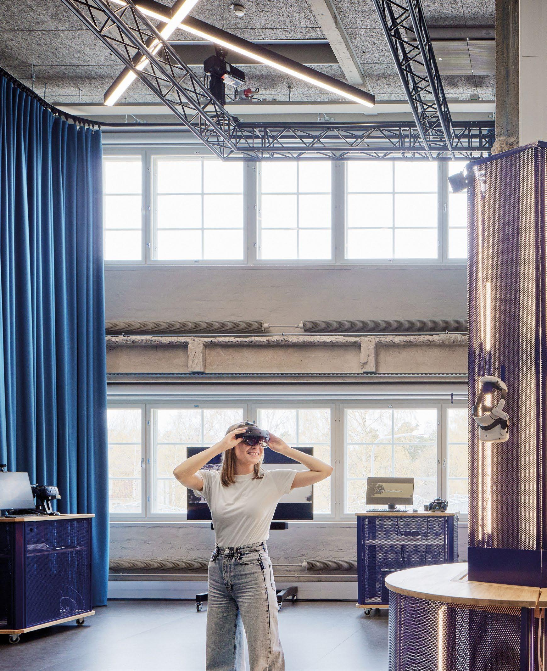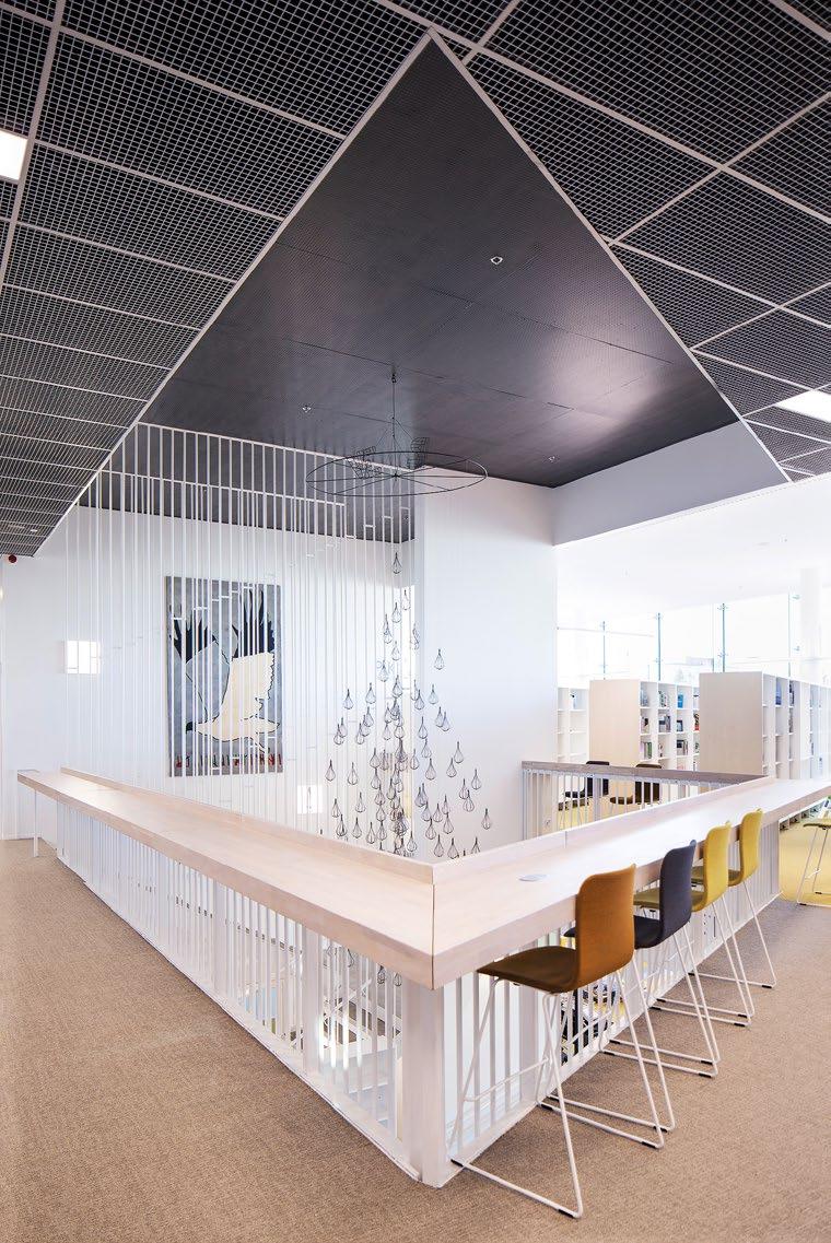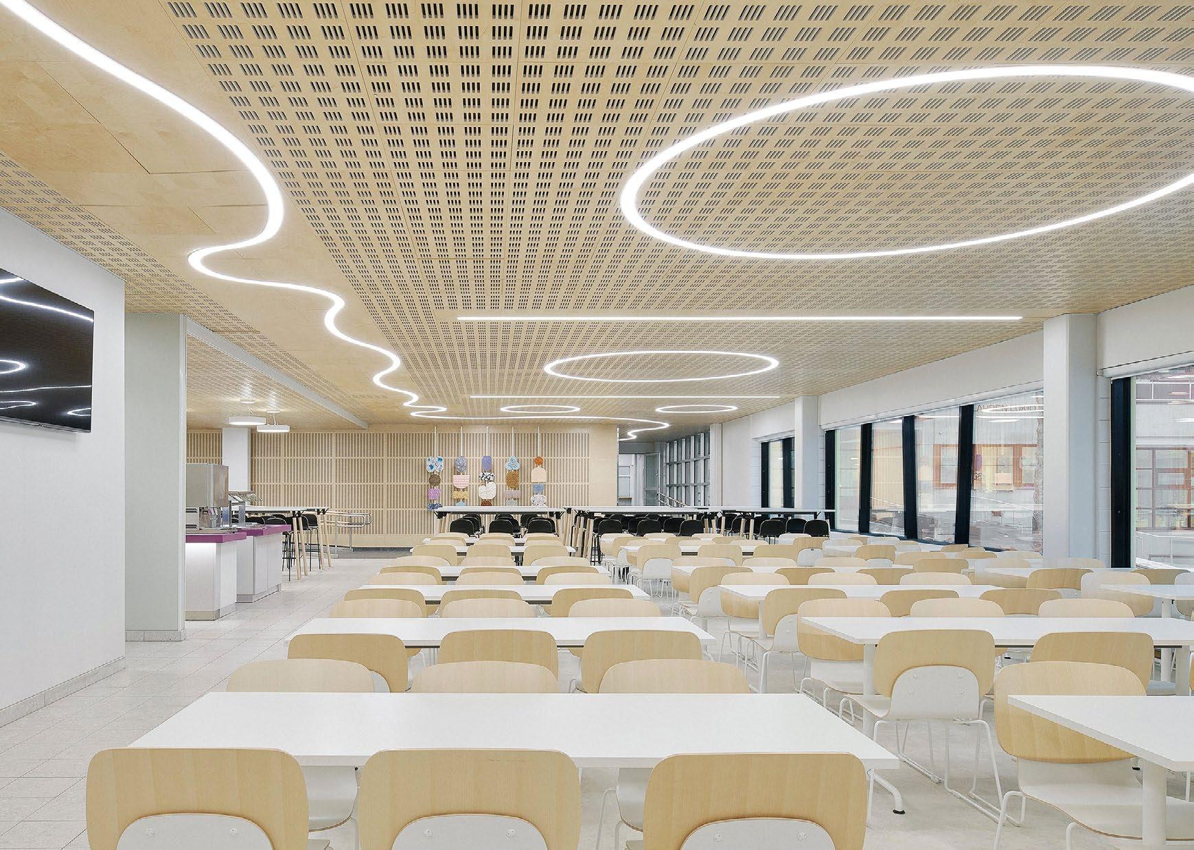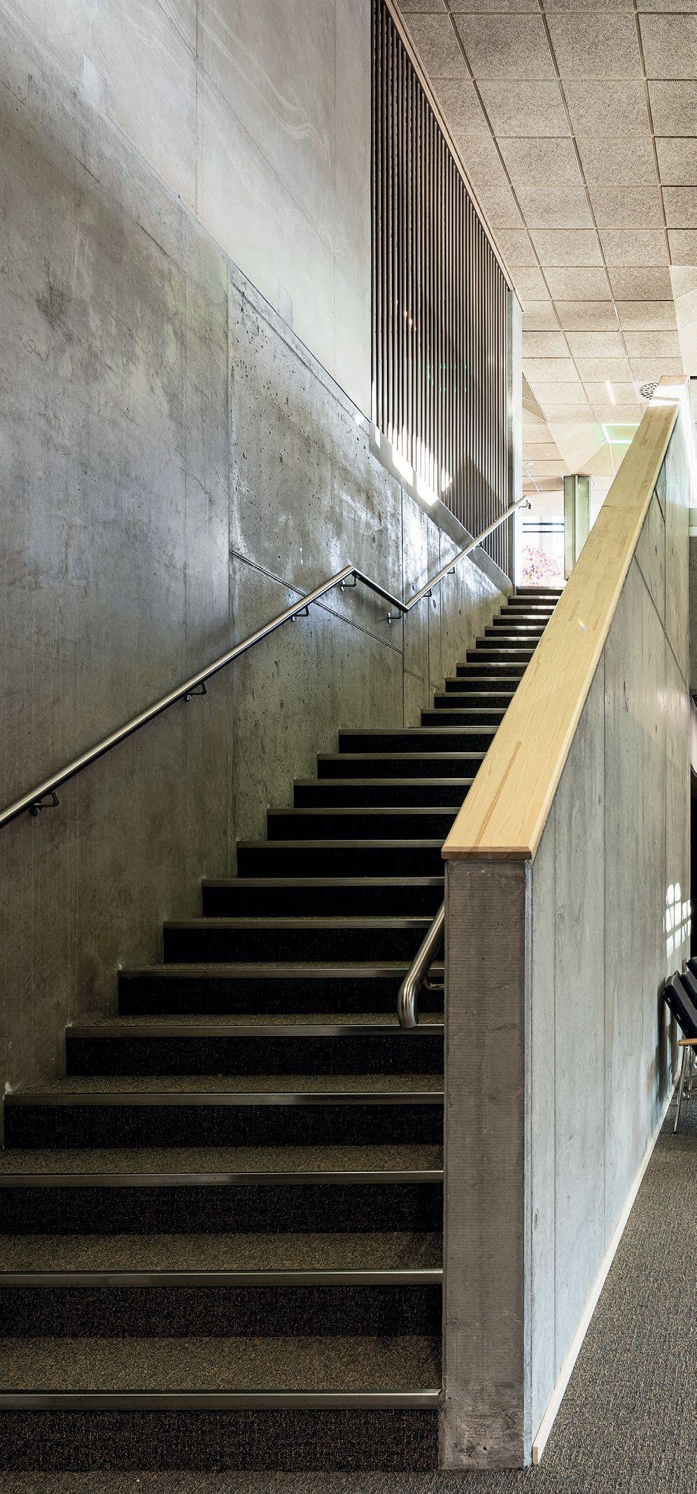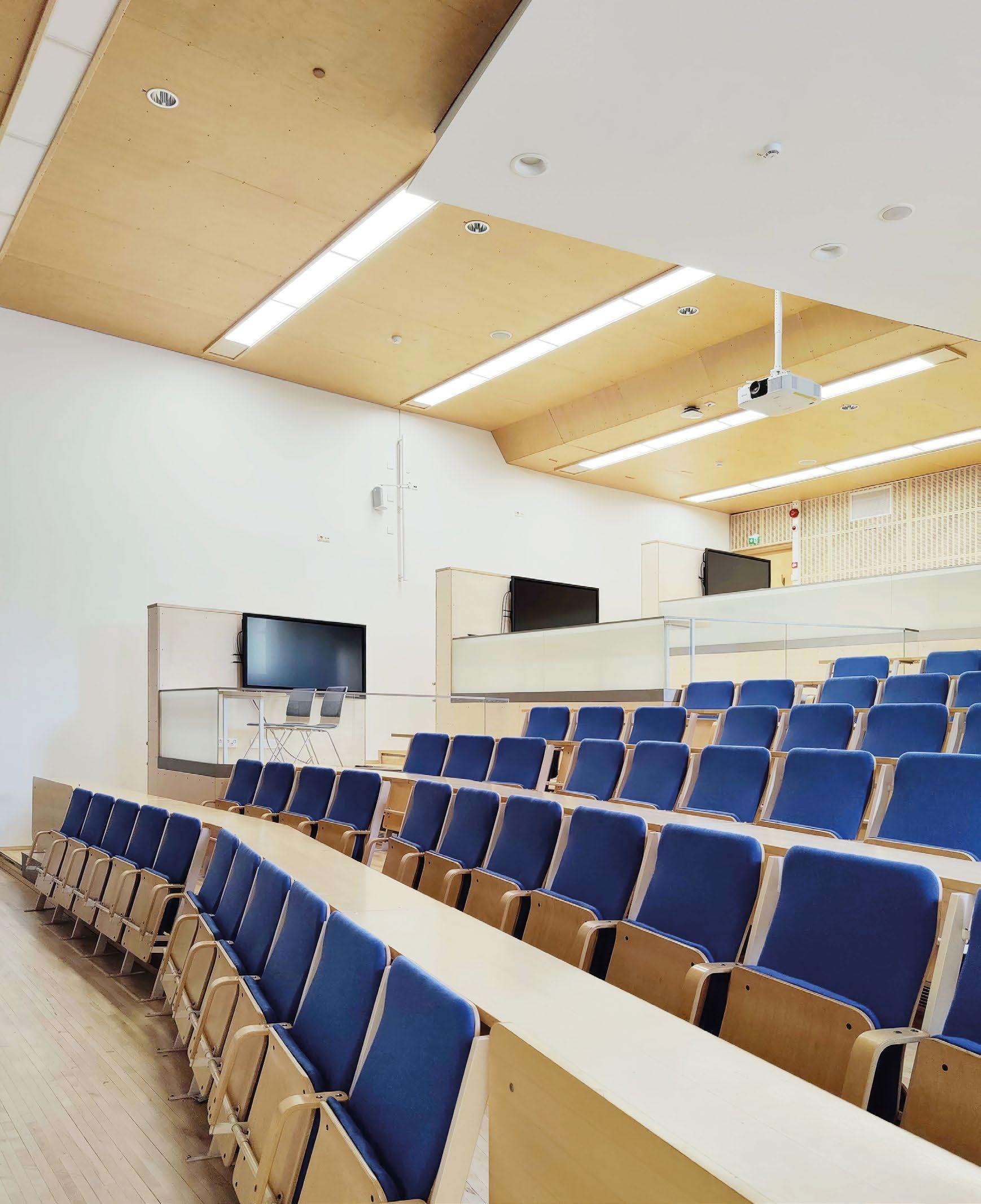 Vyöhykkeellisesti hierarkkisessa tilaratkaisussa avoimet ryhmätyöskentelyä painottavat oppimisympäristöt ovat aulan vierellä ja työrauhaa vaativat tilat kerroksen ulkoreunoilla. Katsomoportaissa näkyy kohteen sisustuksen keskeinen pari: puu ja betoni. Kovan ja rouhean betonin parina sisäpinnoissa on käytetty puuta monessa eri muodossa. Puun ja betonin lisäksi väripaletin peruselementtejä ovat puhdas valkoinen, dramaattinen musta ja metallinhohtoinen samppanjan sävy. Kirkkaampia tehostesävyjä on vain ripaus. Neutraali ja luonnonläheinen väritys jättääkin hyvin tilaa opiskelijoiden tuottamalle taiteelle. (01)