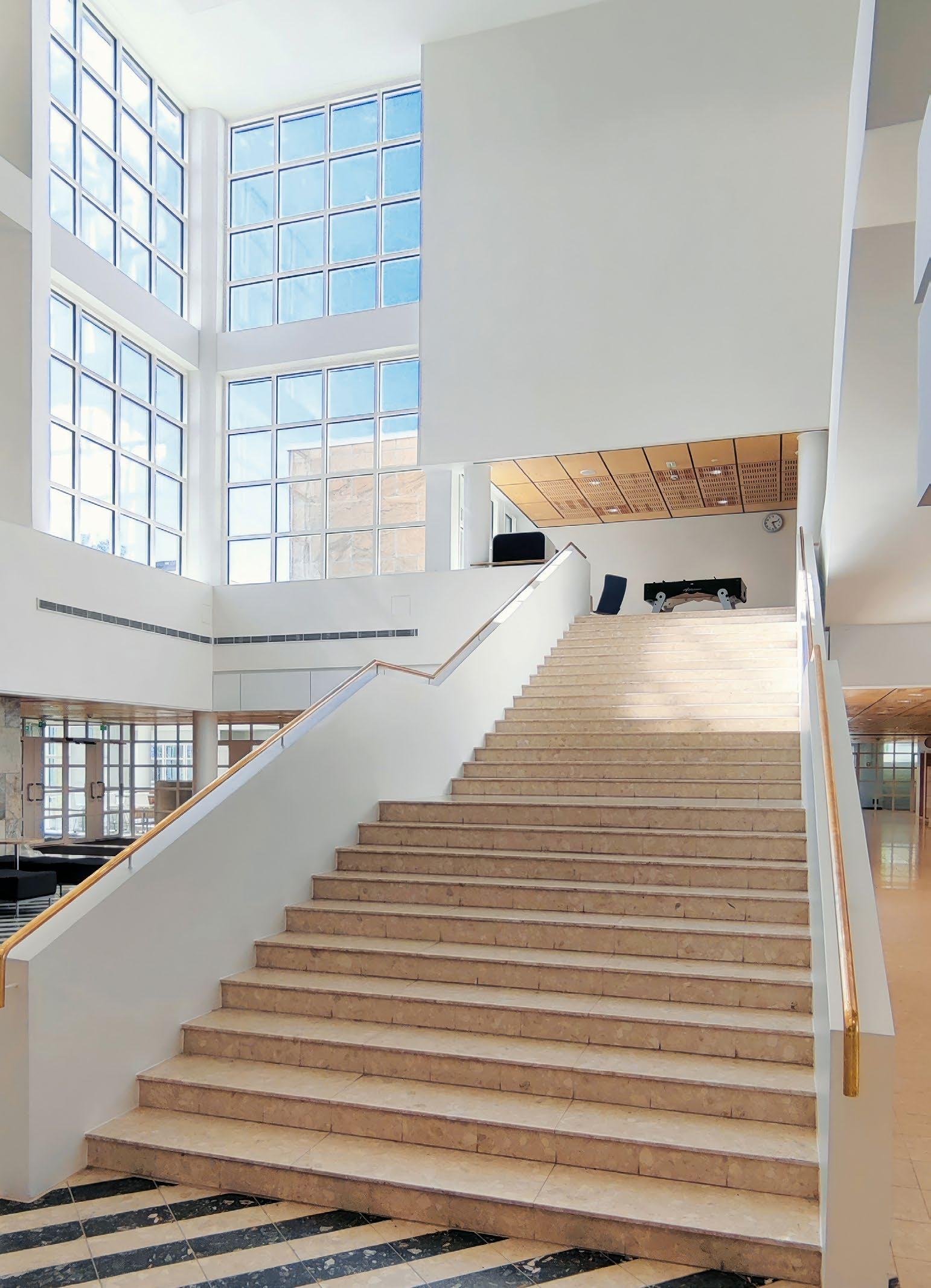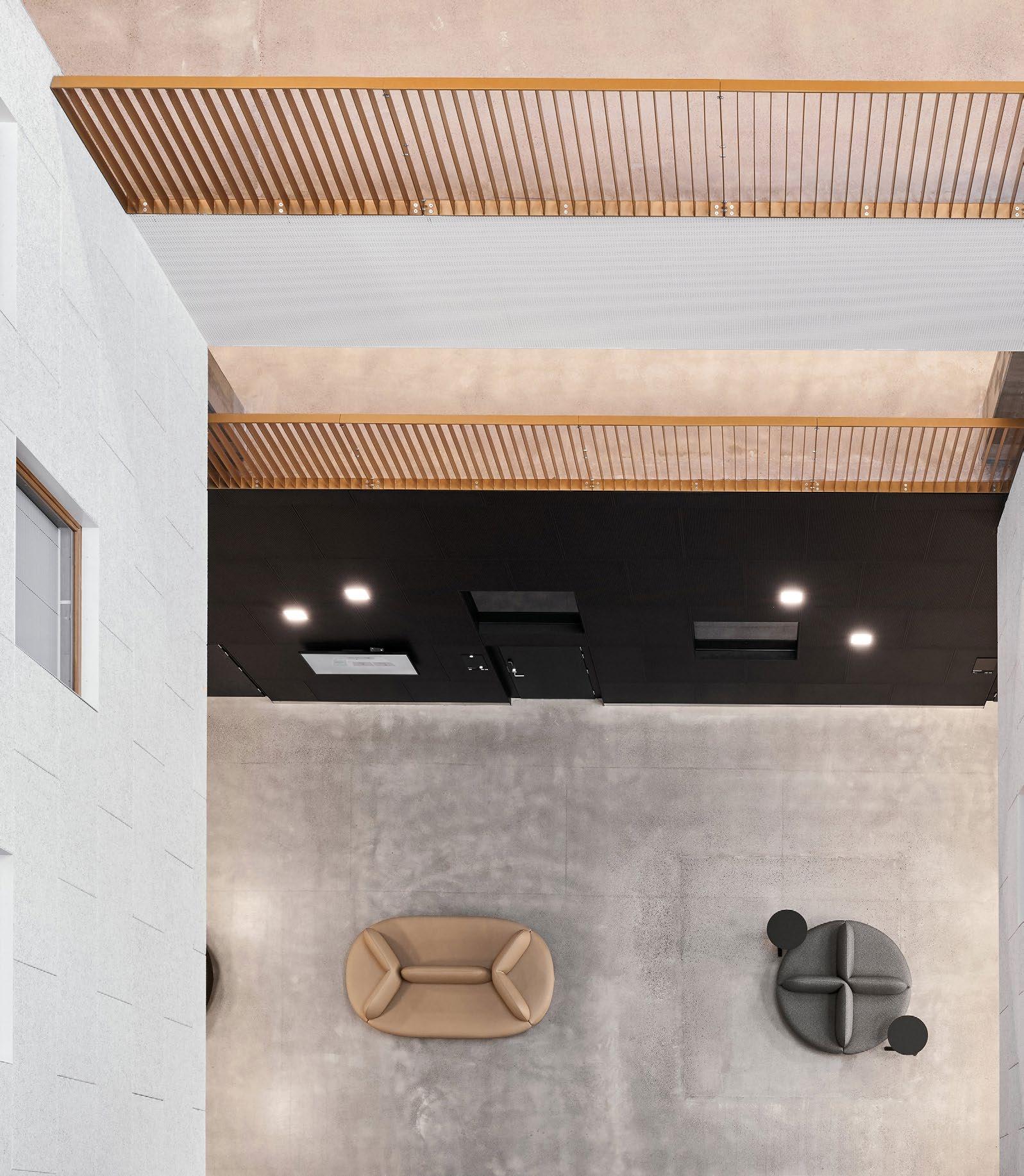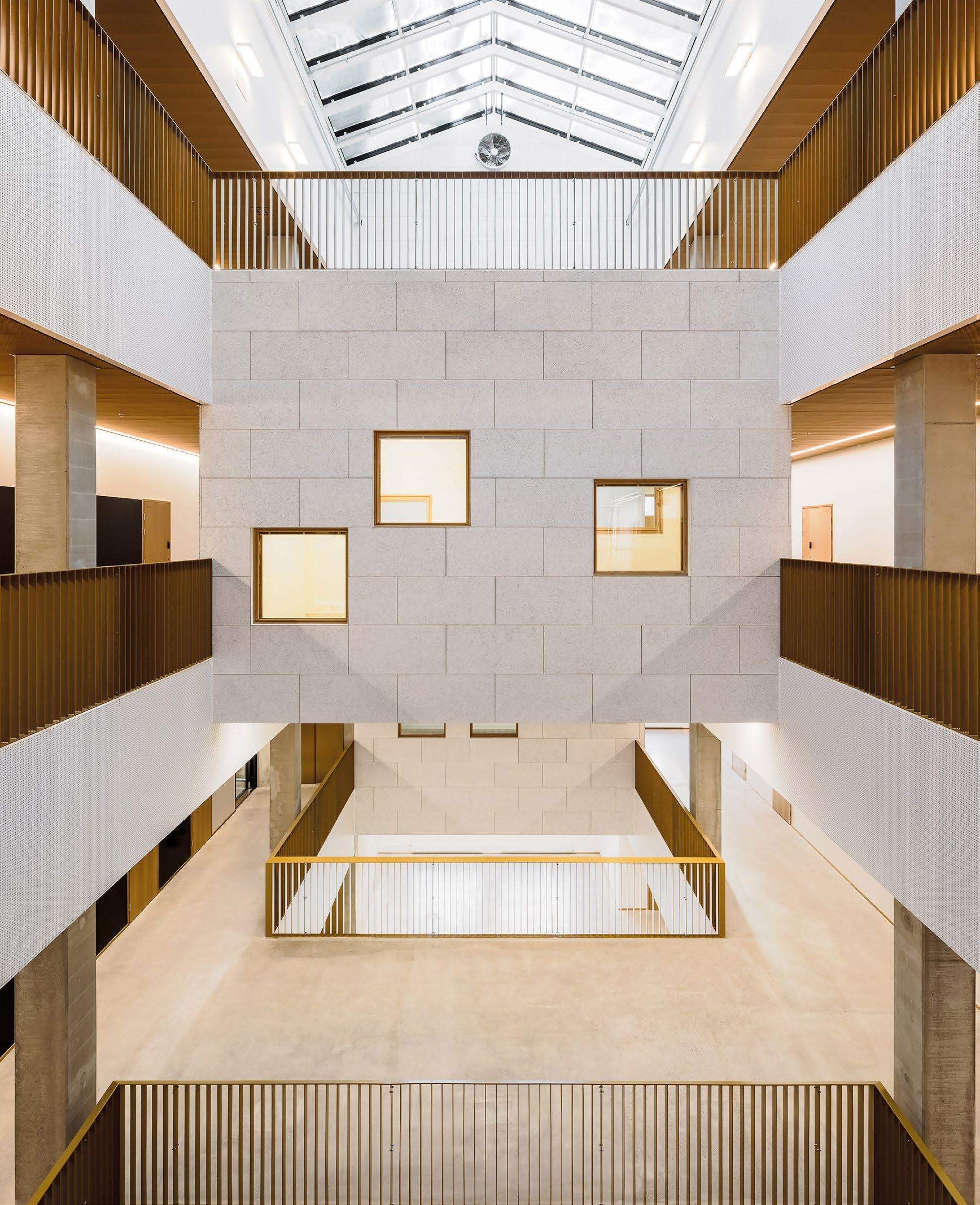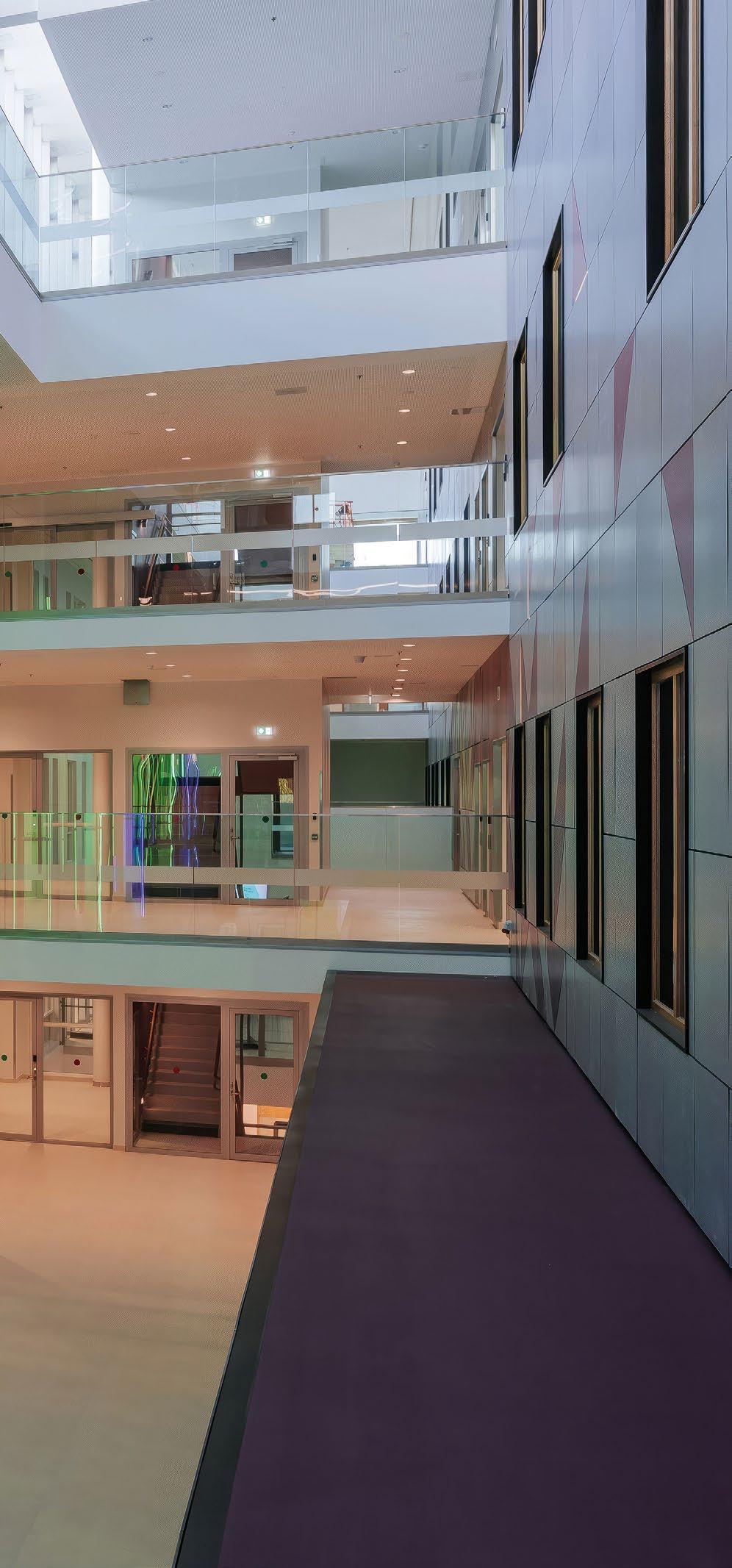 Vyöhykkeellisesti hierarkkisessa tilaratkaisussa avoimet ryhmätyöskentelyä painottavat oppimisympäristöt ovat aulan vierellä ja työrauhaa vaativat tilat kerroksen ulkoreunoilla. Katsomoportaissa näkyy kohteen sisustuksen keskeinen pari: puu ja betoni. Kovan ja rouhean betonin parina sisäpinnoissa on käytetty puuta monessa eri muodossa. Puun ja betonin lisäksi väripaletin peruselementtejä ovat puhdas valkoinen, dramaattinen musta ja metallinhohtoinen samppanjan sävy. Kirkkaampia tehostesävyjä on vain ripaus. Neutraali ja luonnonläheinen väritys jättääkin hyvin tilaa opiskelijoiden tuottamalle taiteelle. (01)