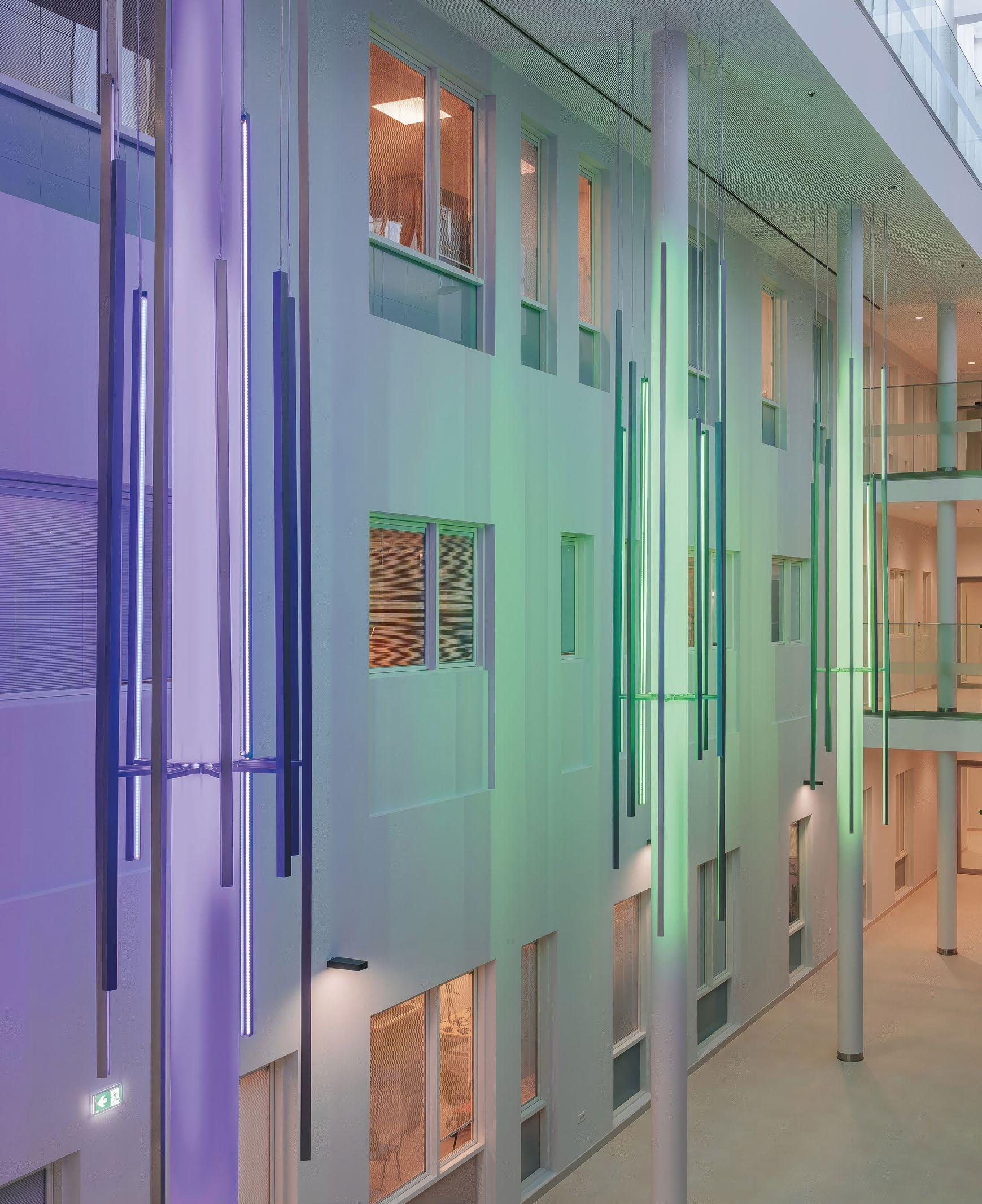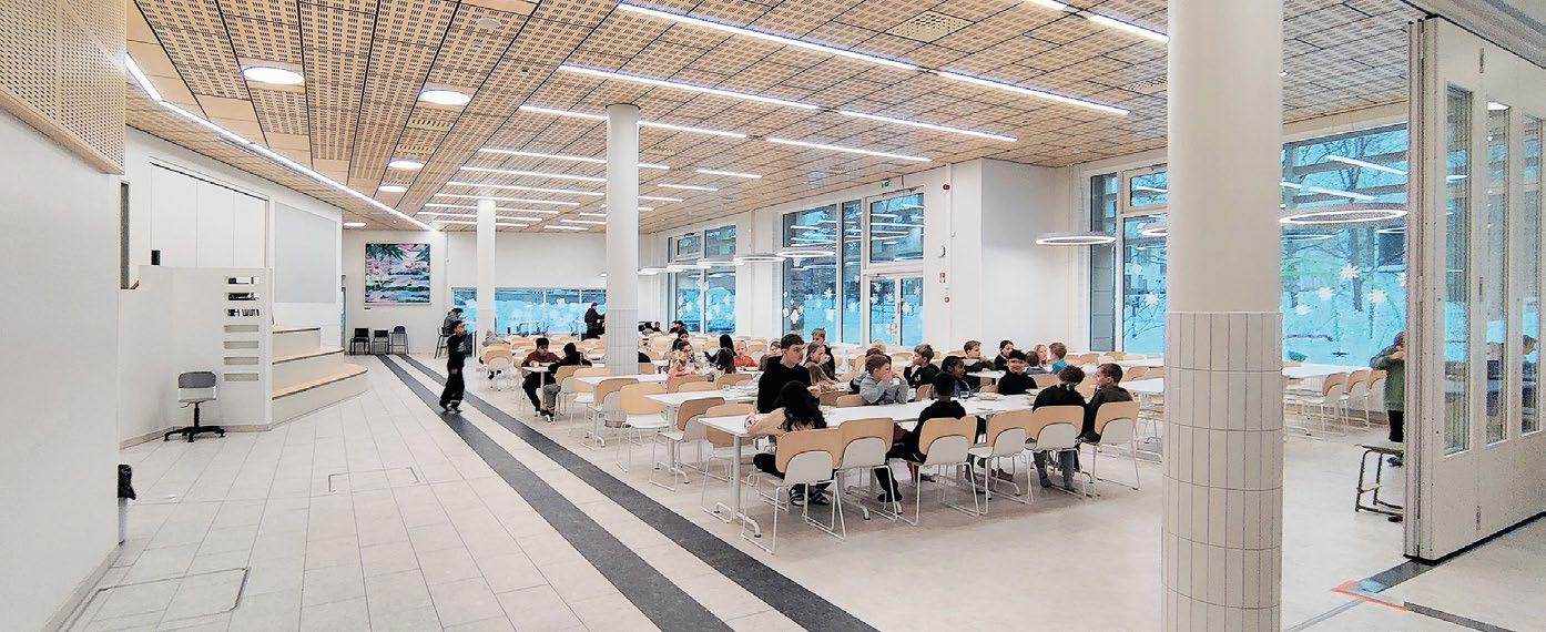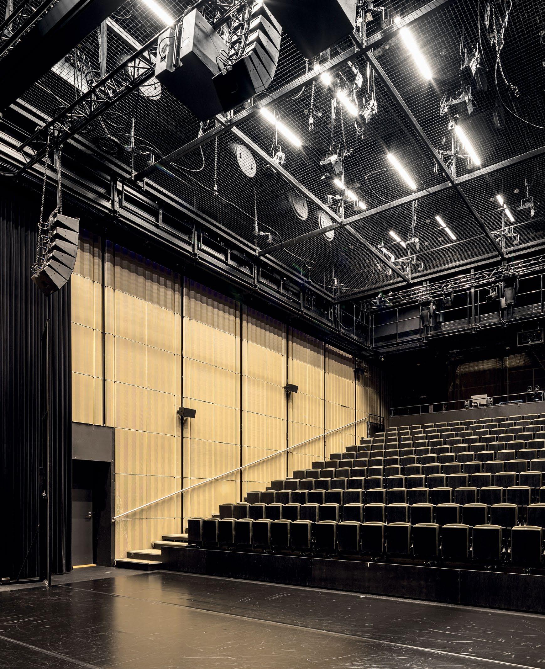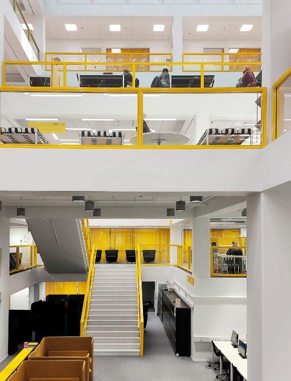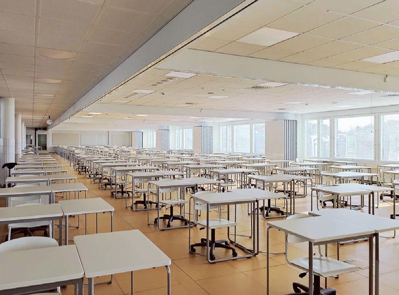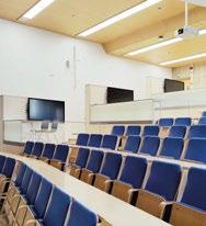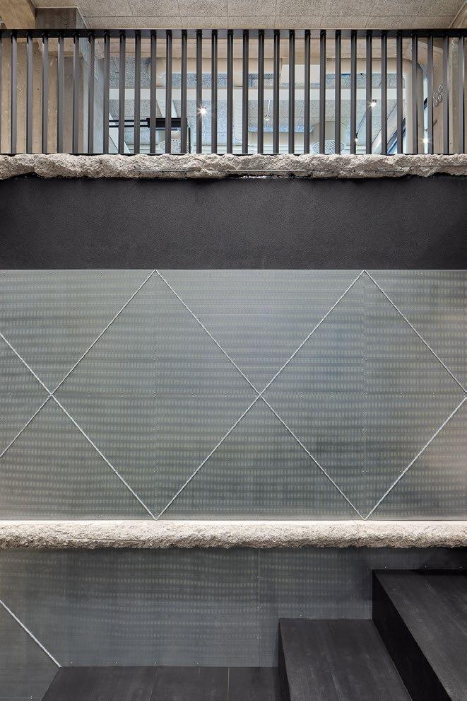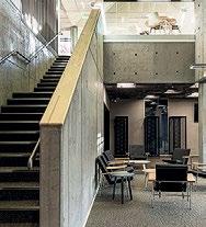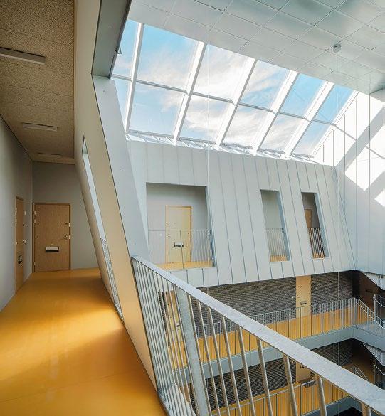 Vyöhykkeellisesti hierarkkisessa tilaratkaisussa avoimet ryhmätyöskentelyä painottavat oppimisympäristöt ovat aulan vierellä ja työrauhaa vaativat tilat kerroksen ulkoreunoilla. Katsomoportaissa näkyy kohteen sisustuksen keskeinen pari: puu ja betoni. Kovan ja rouhean betonin parina sisäpinnoissa on käytetty puuta monessa eri muodossa. Puun ja betonin lisäksi väripaletin peruselementtejä ovat puhdas valkoinen, dramaattinen musta ja metallinhohtoinen samppanjan sävy. Kirkkaampia tehostesävyjä on vain ripaus. Neutraali ja luonnonläheinen väritys jättääkin hyvin tilaa opiskelijoiden tuottamalle taiteelle. (01)
