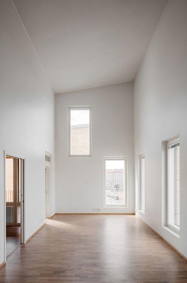 Asukastalo avautuu kohti Rullakkotoria, jonka ulkotilat jatkuvat visuaalisesti ja toiminnallisesti rakennuksen sisään.