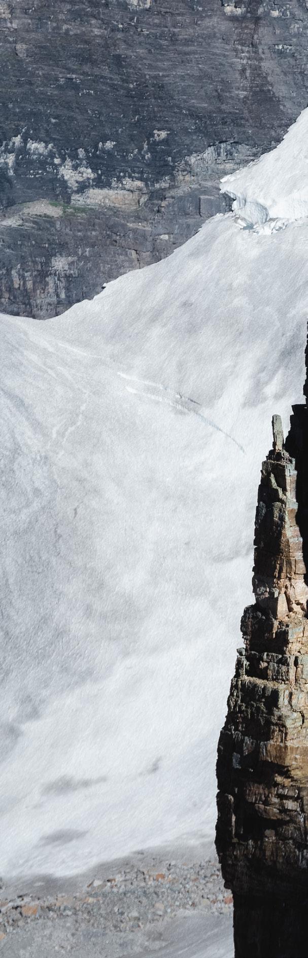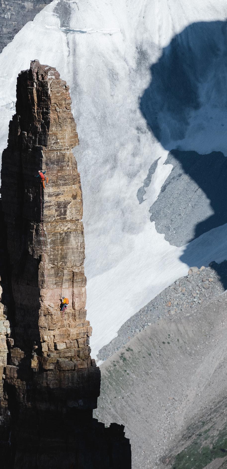 “ The idea for this photograph and adventure has been a culmination of many years and photographic attempts in the Lake Louise area of Banff National Park. The Grand Sentinel is an iconic 400-foot obelisk quartzite rock tower located near the popular Moraine Lake nestled in the Canadian Rockies. Of the two prominent climbing routes featured on the Sentinel, I chose to photograph Cardiac Arete, which follows the south-facing edge of the spire. My goal was to capture the first light to hit the tower as our team of climbers ascended the final pitch.