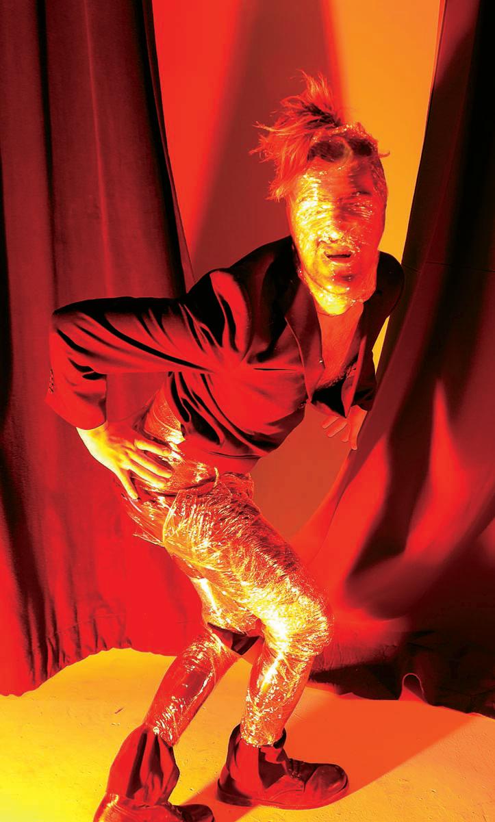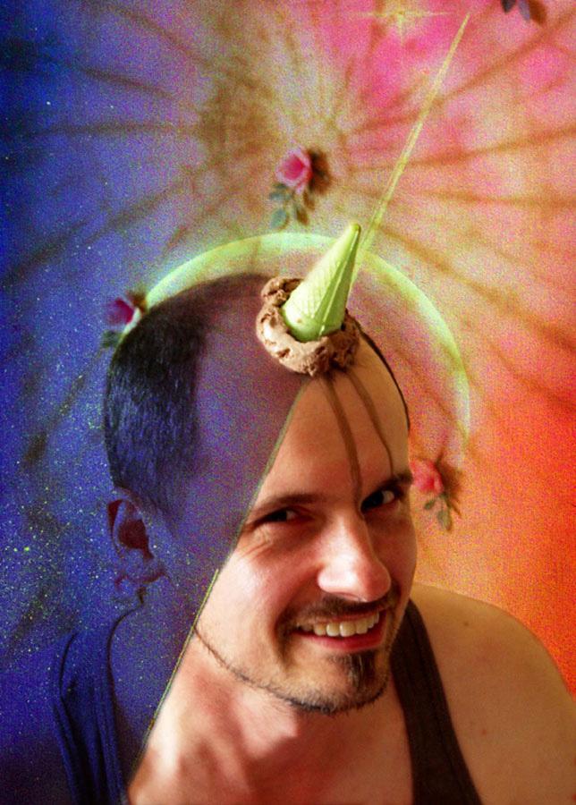 Sanding birch floors I had to wear a dust mask. I took a selfie of the alien wannabe, which I converted to a monochrome negative to create a gum print. I like mixing the paint, the chemical and the gum arabic then brushing the mixture on the paper. For the first attempt I chose a red layer followed by a black layer, plus I added some yellow by hand. But I thought I could do better. So I went for an orange layer followed by blue in the upper area. Later I added a thin black layer to the mask to improve detail and definition. As paper prints the red one is darker and most people would prefer the orange version.