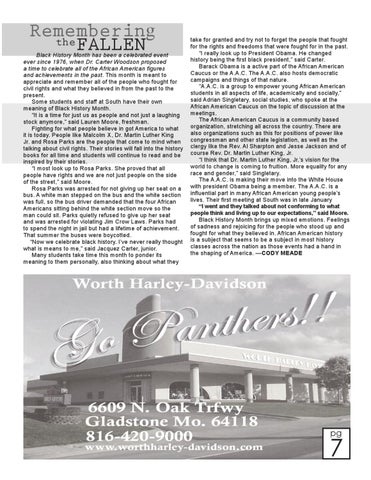 take for granted and try not to forget the people that fought for the rights and freedoms that were fought for in the past. “I really look up to President Obama. He changed history being the first black president,” said Carter. Barack Obama is a active part of the African American Caucus or the A.A.C. The A.A.C. also hosts democratic campaigns and things of that nature. “A.A.C. is a group to empower young African American students in all aspects of life, academically and socially,” said Adrian Singletary, social studies, who spoke at the African American Caucus on the topic of discussion at the meetings. The African American Caucus is a community based organization, stretching all across the country. There are also organizations such as this for positions of power like congressman and other state legislation, as well as the clergy like the Rev. Al Sharpton and Jesse Jackson and of course Rev. Dr. Martin Luther King, Jr. “I think that Dr. Martin Luther King, Jr.’s vision for the world to change is coming to fruition. More equality for any race and gender,” said Singletary. The A.A.C. is making their move into the White House with president Obama being a member. The A.A.C. is a influential part in many African American young people’s lives. Their first meeting at South was in late January “I went and they talked about not conforming to what people think and living up to our expectations,” said Moore. Black History Month brings up mixed emotions. Feelings of sadness and rejoicing for the people who stood up and fought for what they believed in. African American history is a subject that seems to be a subject in most history classes across the nation as those events had a hand in the shaping of America. —CODY MEADE