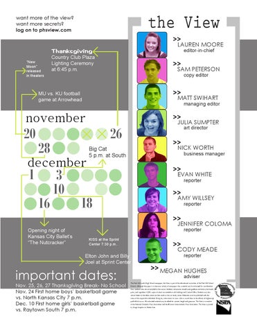 The Park Hill south High School newspaper, the View, is part of the educational curriculum of the Park Hill School District. Although the paper is a classroom activity of newspaper class, material may be submitted for consideration from students who are not enrolled in the course. Students’ submission should meet guidlines set forth in the board policy and regulation IGDB, copies of which are available in all buildings and Central Office. Students may also submit letters to the editor which are 500 words or less on timely issues. Editorials must be published with the name of the responsible individual. Bring any submissions to room c200 or e-mail them to the adviser at hughesm@ parkhill.k12.mo.us. All submitted material may be edited for content, length and grammar. The View is a member of the National Scholastic Press Association and the Missouri Interscholastic Press Association. The View is printed by Osage Graphics in Olathe, Kan.