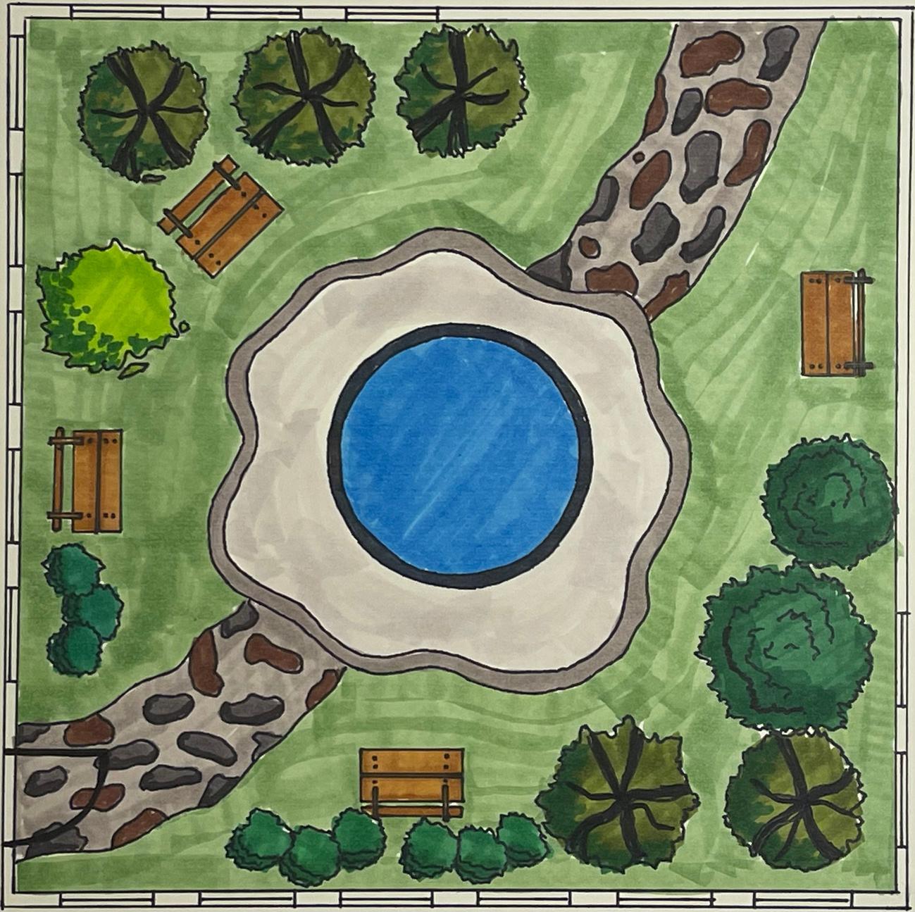 The original drawing had many accidental errors, such as the ink dropped from the markers on the pool, a yellow stain on the sky, and some pencil marks. Therefore, I used the copy-and-paste features on Adobe Photoshop and topped the errors with cleaner parts of the drawings. By doing this, the errors on the drawing are removed, making it looks neat and tidy.