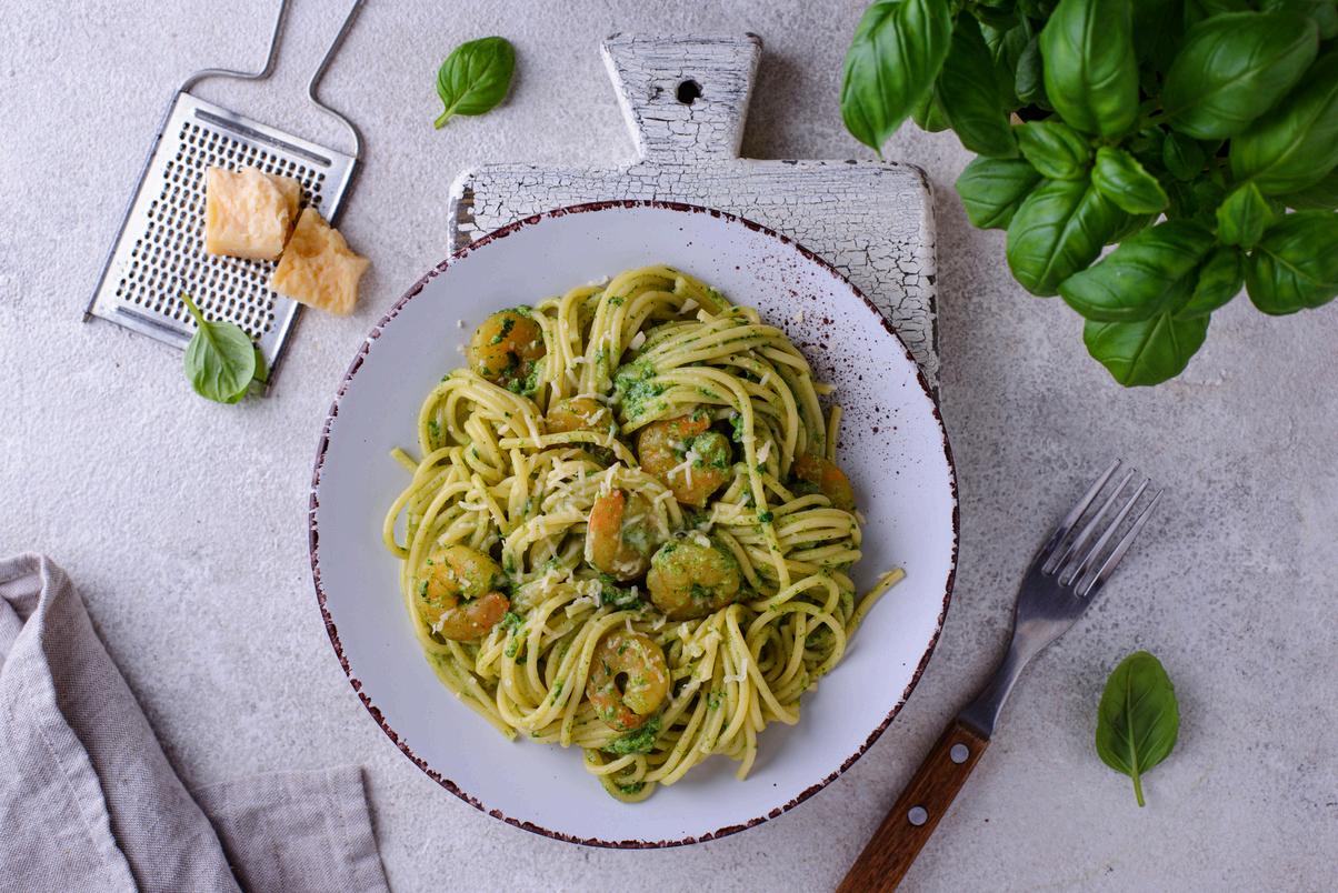Sautéed shrimp tossed in a creamy pesto sauce with linguine pasta and sun-dried tomatoes.