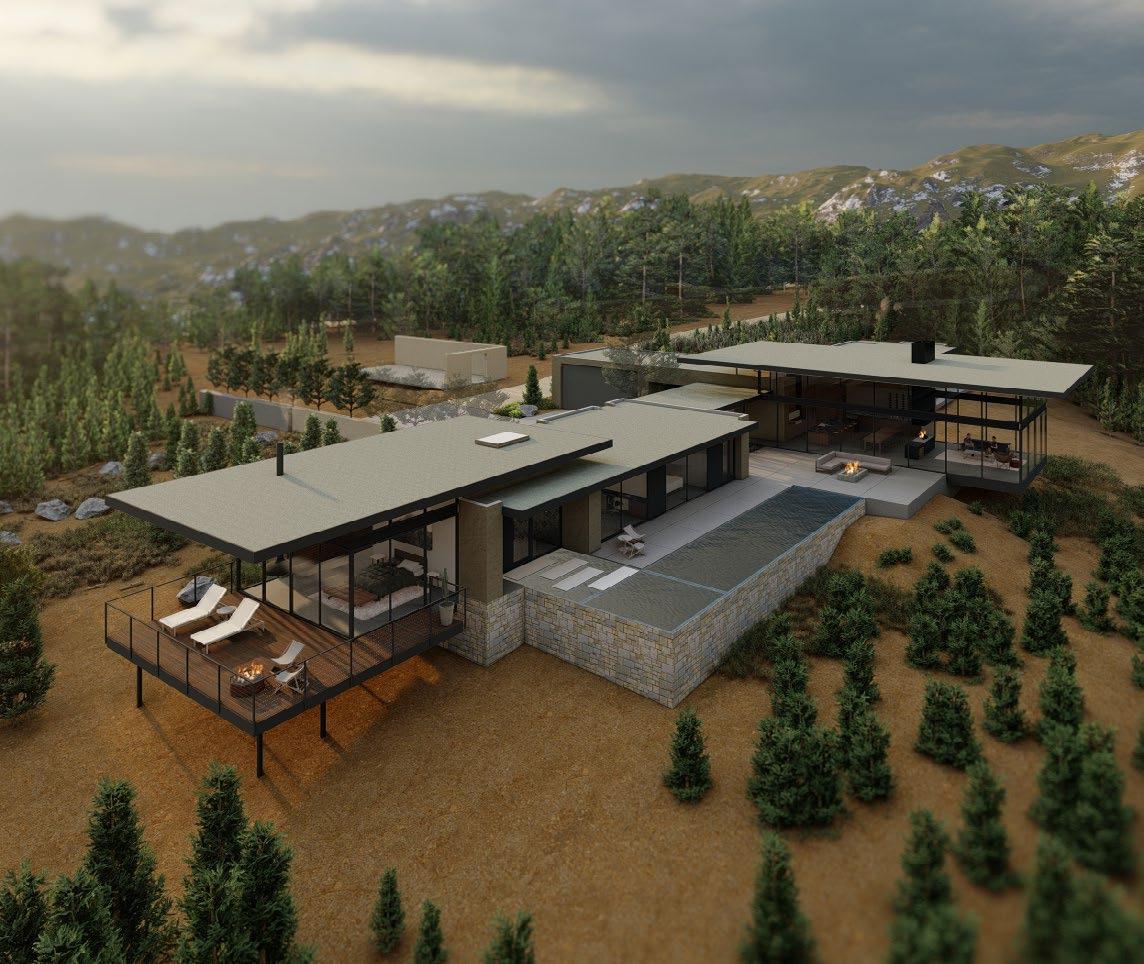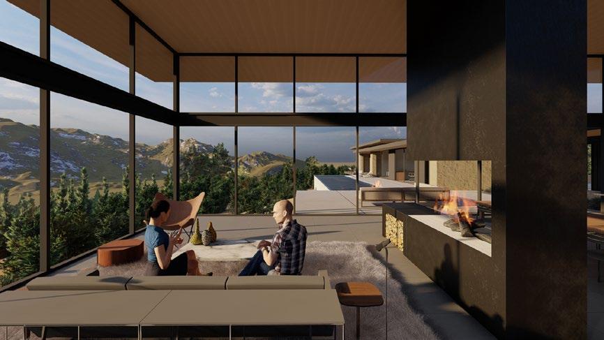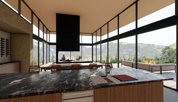The layout was informed by site topography to ground the living space and utilize views of the neighboring mountain peak.