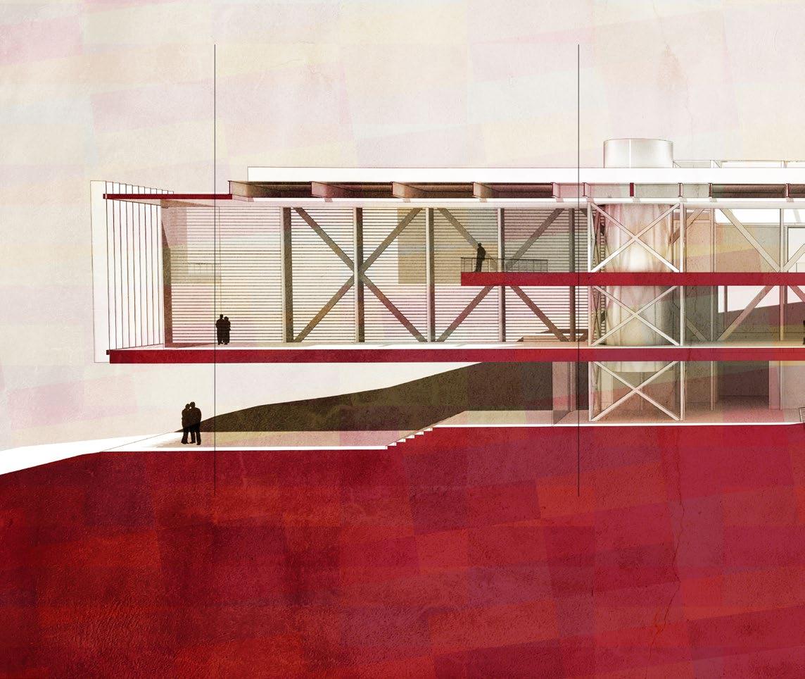 The cantilevered portion of the building is supported by large core. The brewhouse grain silo is then placed within the core.