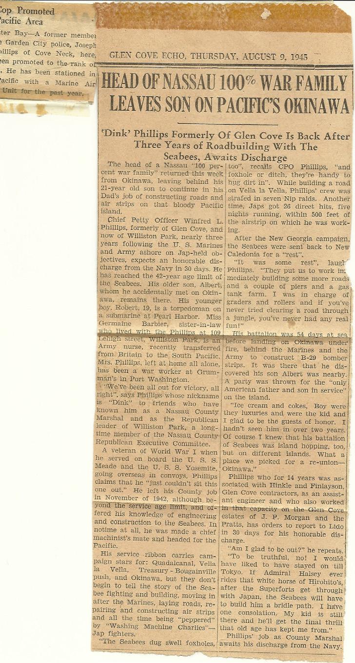 Dad was the youngest of 16 - 14 boys, 2 girls. 3 of the boys served in WWI and my uncle Perce was awarded a Silver Star for action in France with the USA 77th Division. 5 siblings served in WWII, my dad with the Marines who spent 20+ months in the Pacific. 1, uncle Dink fought in both wars and ran into his son while landing under fire in Okinawa, who was also a USN CB.
