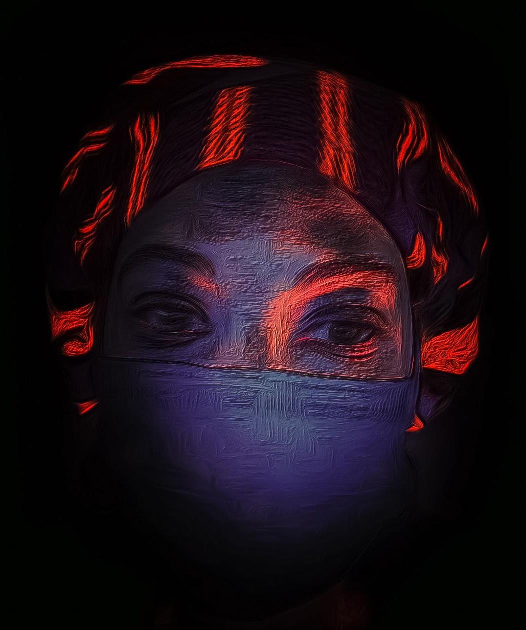 This abstract work of art titled “Mind Games” was created by physician artist Dr Lucie Mitchell using an image of one of her own cervical vertebrae. It represents the games our brains play when we become pre-occupied with unrelenting thoughts and worries. Unable to rest, we become bleary-eyed and unable to focus on the days ahead.
