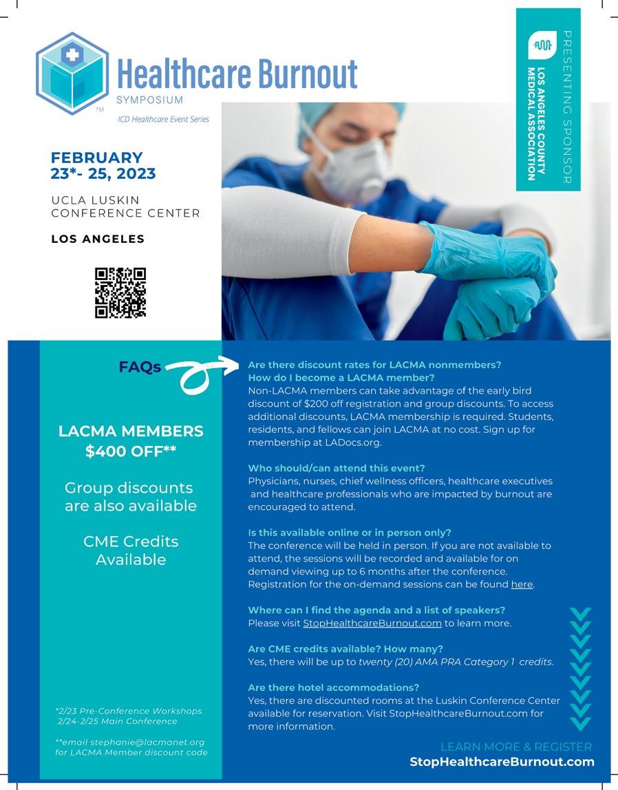 Kicking off on the 23rd with pre-conference workshops and immersive experiences for physicians. The main conference, on the 24th & 25th, will welcome nationally recognized speakers including a first-ofits-kind physician panel discussion on gun violence sponsored by the Cooperative of American Physicians. The multi-day event will offer CMEs and provide solutions to the burnout epidemic plaguing the profession. Members of LACMA receive a $400 discount for this profoundly impactful event. And to compound the impact, LACMA is extending this exclusive discount to our members’ key