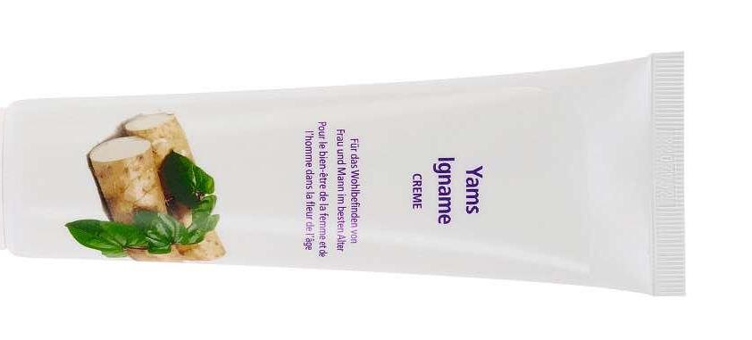 Crème nourrissante àl’extraitd’igname bio fraîche, àl’huile d’amande, de jojobaet au beurredekarité. Effet apaisant et hydratant en casdesécheresse cutanée d’origine hormonale.