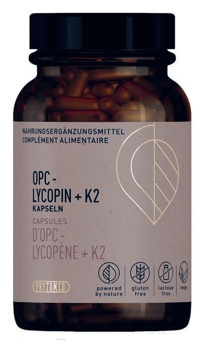 Les gélules d’OPC-LYCOPIN + K2 PHYTOMED contiennent 115 mg d’extrait de pépins de raisin rouge avec 75 mg d’OPC (oligomères proanthocyanidines), 143 mg d’extrait de tomate avec 7,5 mg de lycopène, ainsi que 37,5 µg de vitamine K2 (ménaquinone-7) dans une enveloppe végétale.