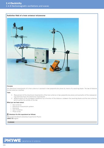Principle The directional characteristic of a horn antenna is received in two perpendicular planes by means of a receiving dipole. The law of distance for the antenna is verified. Tasks 1. 2.