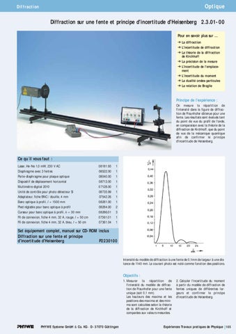 Diffraction sur une fente et principe d'incertitude d'Heisenberg 2.3.01-00 Pour en savoir plus sur … La diffraction L'incertitude de diffraction La théorie de la diffraction de Kirchhoff La précision de la mesure L'incertitude de l'emplacement L'incertitude du moment La dualité ondes-particules La relation de Broglie