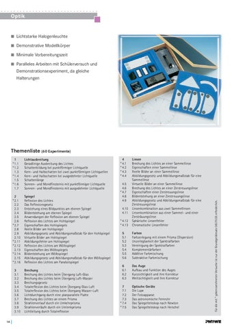 Brechung Brechung des Lichtes beim Übergang Luft-Glas Brechung des Lichtes beim Übergang Luft-Wasser Brechungsgesetz Totalreflexion des Lichtes beim Übergang Glas-Luft Totalreflexion des Lichtes beim Übergang Wasser-Luft Lichtdurchgang durch eine planparallele Platte Brechung des Lichtes an einem Prisma Strahlenverlauf durch ein Umkehrprisma Strahlenverläufe durch ein Umlenkprisma Lichtleitung durch Totalreflexion