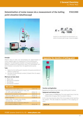 Didactic setup to train and demonstrate the determination of molar masses by way of a measurement of the boiling point elevation. The boiling point elevation of aqueous solutions of different substances is determined using. The ebullioscopic constant of water is calculated from the experimental results. Tasks 1. Determine the boiling point elevation of aqueous solutions of different substances. 2. Calculate the ebullioscopic constant of water from the experimental results. What you can learn about ▪ ▪ ▪ ▪