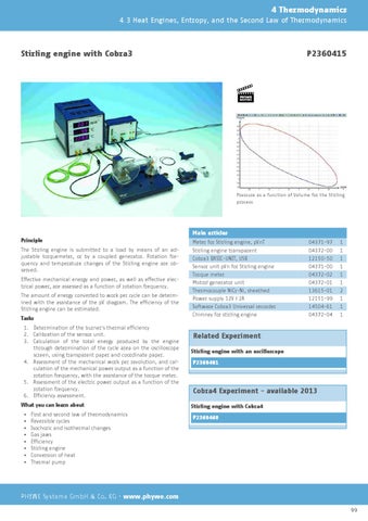 Main articles Principle The Stirling engine is submitted to a load by means of an adjustable torquemeter, or by a coupled generator. Rotation frequency and temperature changes of the Stirling engine are observed. Effective mechanical energy and power, as well as effective electrical power, are assessed as a function of rotation frequency. The amount of energy converted to work per cycle can be determined with the assistance of the pV diagram. The efficiency of the Stirling engine can be estimated. Tasks 1. Determination of the burner's thermal efficiency 2. Calibration of the sensor unit. 3. Calculation of the total energy produced by the engine through determination of the cycle area on the oscilloscope screen, using transparent paper and coordinate paper. 4. Assessment of the mechanical work per revolution, and calculation of the mechanical power output as a function of the rotation frequency, with the assistance of the torque meter. 5. Assessment of the electric power output as a function of the rotation frequency. 6. Efficiency assessment. What you can learn about ▪ ▪ ▪ ▪ ▪ ▪ ▪ ▪