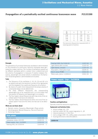 Principle The periodicity of connected stationary oscillators is demonstrated on the example of a continuous, harmonic transverse wave generated by a wave machine. The number of oscillations carried out by different oscillators within a certain time is determined and the velocity of propagation is measured. A relation between frequency, wavelength and phase velocity is established. The formation of standing waves is demonstrated and studied. Tasks