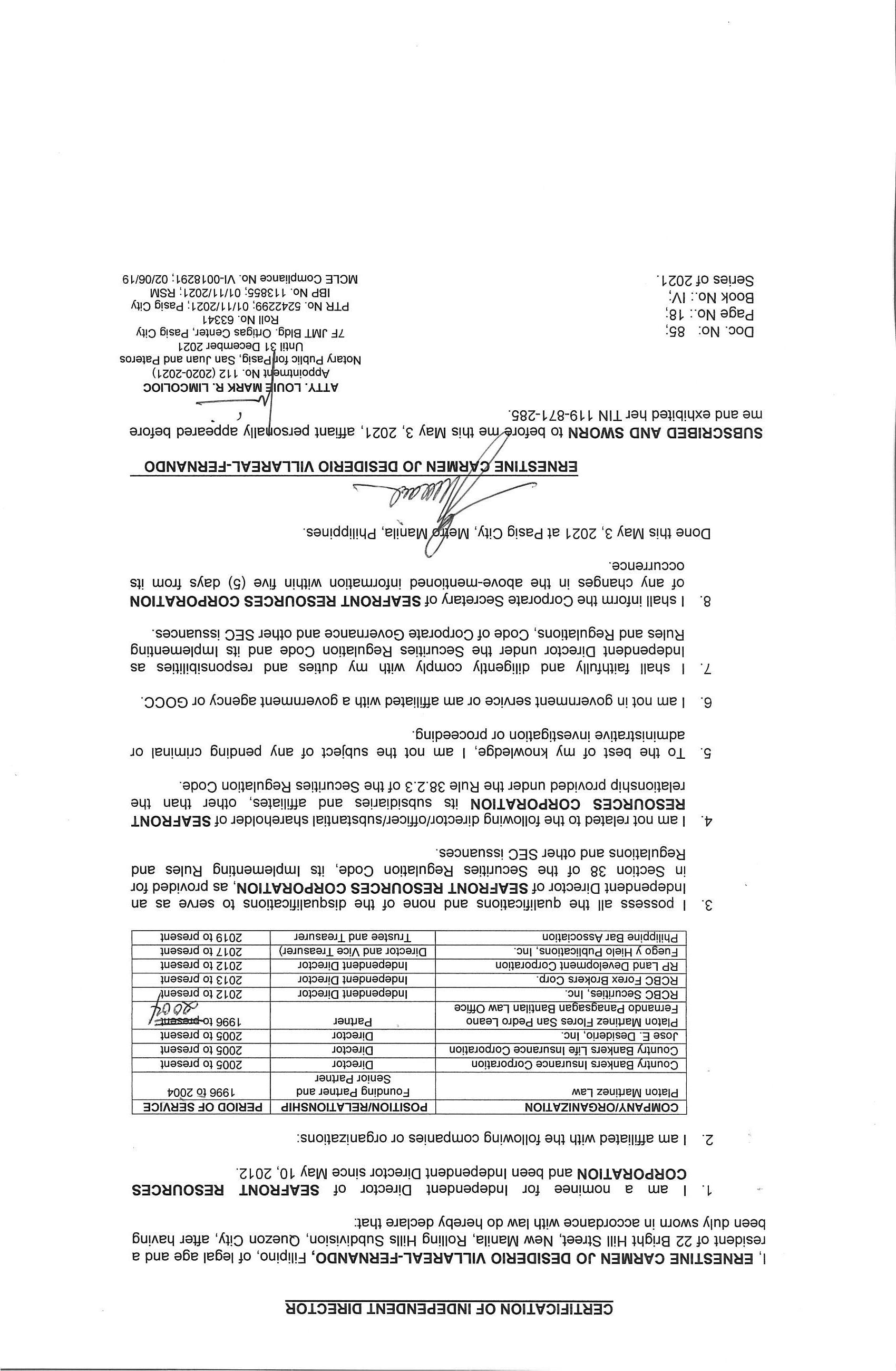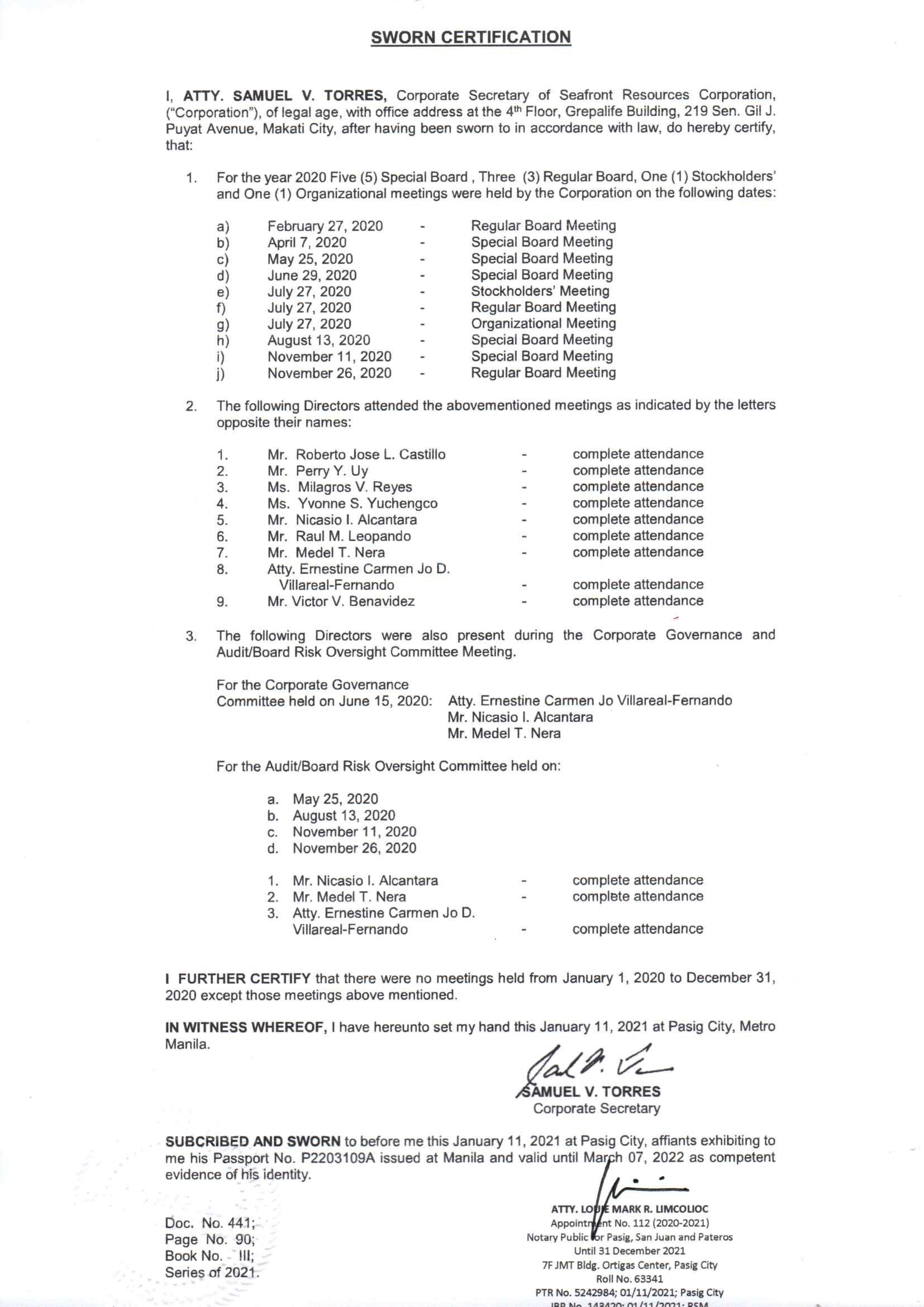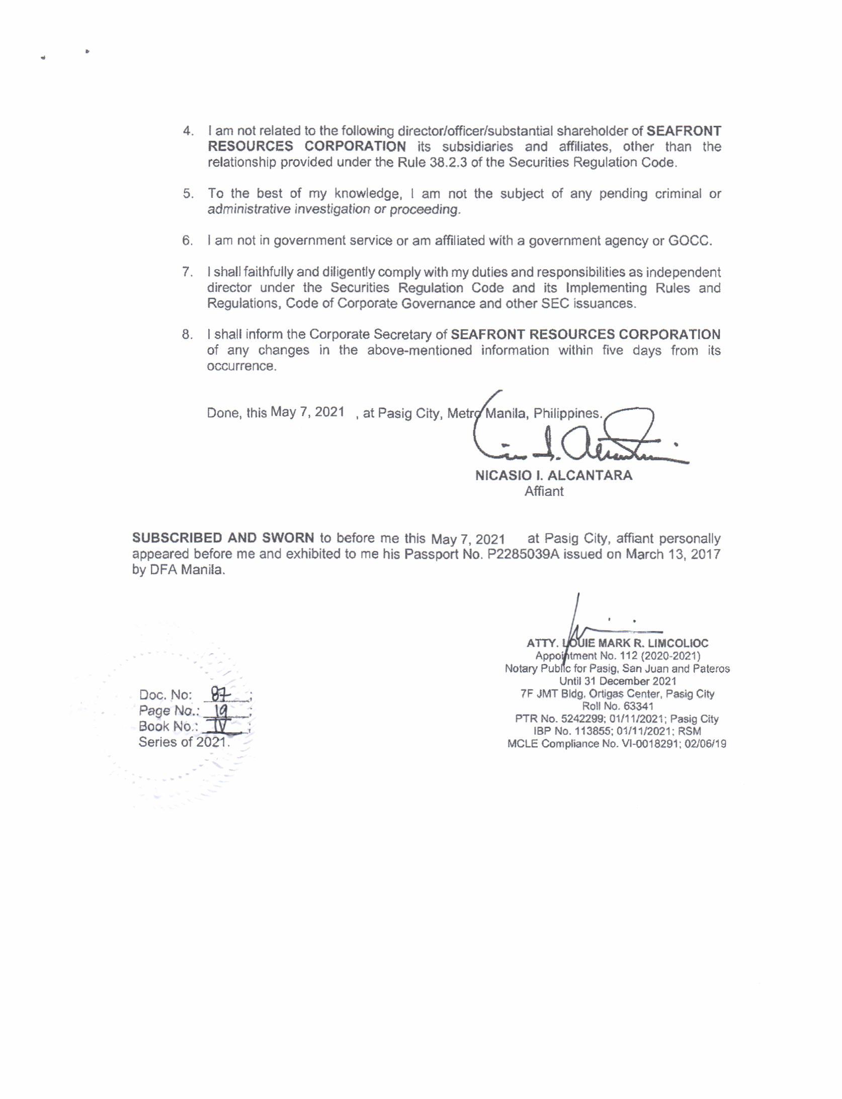 Pursuant to the alternative modes of notice as provided for in the Securities and Exchange Commission’s NOTICE dated April 20, 2020, this notice to Stockholders shall be published in the business section of two (2) newspapers of general circulation, in print and online format, for two (2) consecutive days not later than 21 days before the scheduled meeting The Information Statement, Management Report, SEC Form 17-A and other pertinent meeting documents shall be made available in the Company’s website (www.seafrontresources.com.ph) and via PSE Edge.