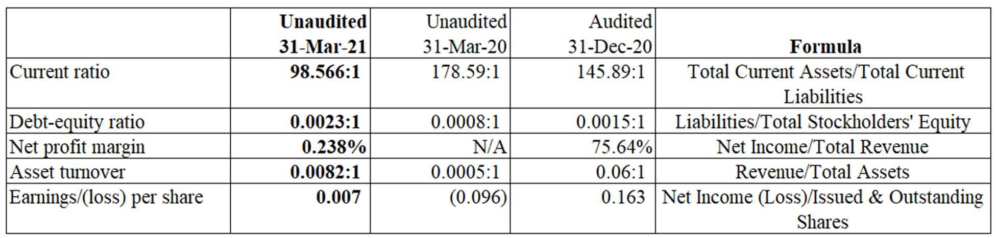 Financialratios 31-Mar-21 (Unaudited) 31-Mar-20 (Unaudited) 31-Dec-20 (Audited) Currentratio Currentassets 98.566:1 178.59:1 14589:1 Currentliabilities Debttoassets Totaldebt 0.09:1 0.10:1 0.09:1 Totalassets Asset-to-equityratio Totalassets 1.10:1 1.12:1 1.10:1 Totalequity Earnings/(loss)pershare Netincome 0.007:1 N/A 0.16257:1 Weighted average no.ofshares Priceearningsratio Closingprice 314.29 N/A 11.38 Earningsper share Returnonrevenue Netincome 0.24 N/A 0.76 Totalrevenue Long-term debt to equity ratio Long-termdebt N/A N/A N/A Equity EBITDA to total interest paid EBITDA* N/A N/A N/A Totalinterestpaid