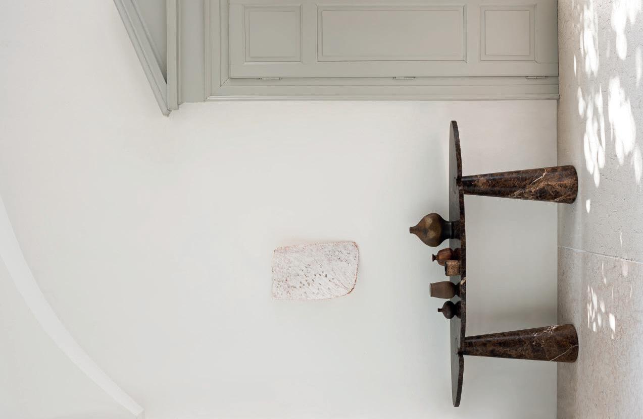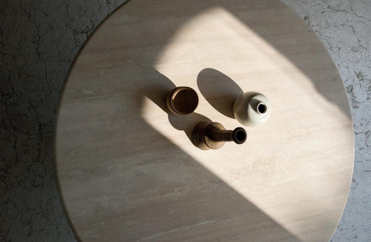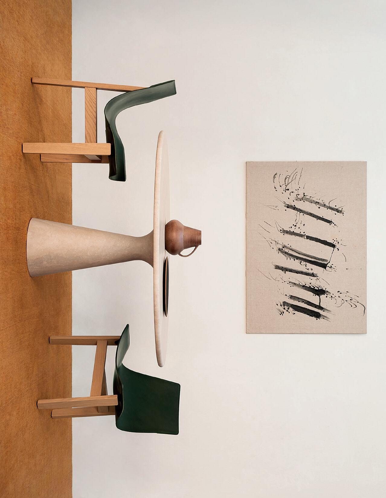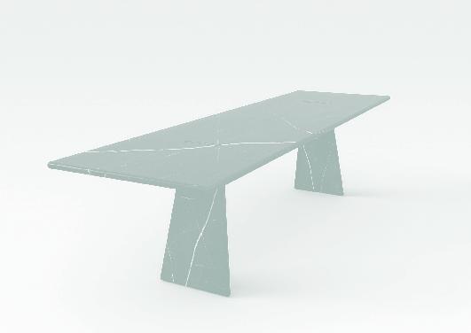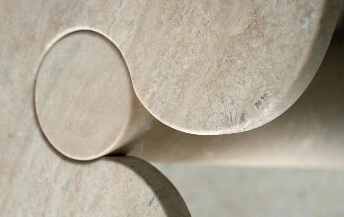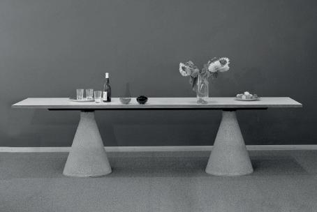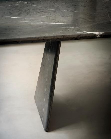 A series of marble tables as the first point of arrival of a research on construction systems with dry joints, and without mechanisms and hardware: for Eros tables, the solution provides for a gravity interlocking between top and vertical support, obtained thanks to the truncatedconical section of the leg that easily accommodates the horizontal element by blocking it in the established position, while the weight of the material increases the strength and stability of the entire structure.