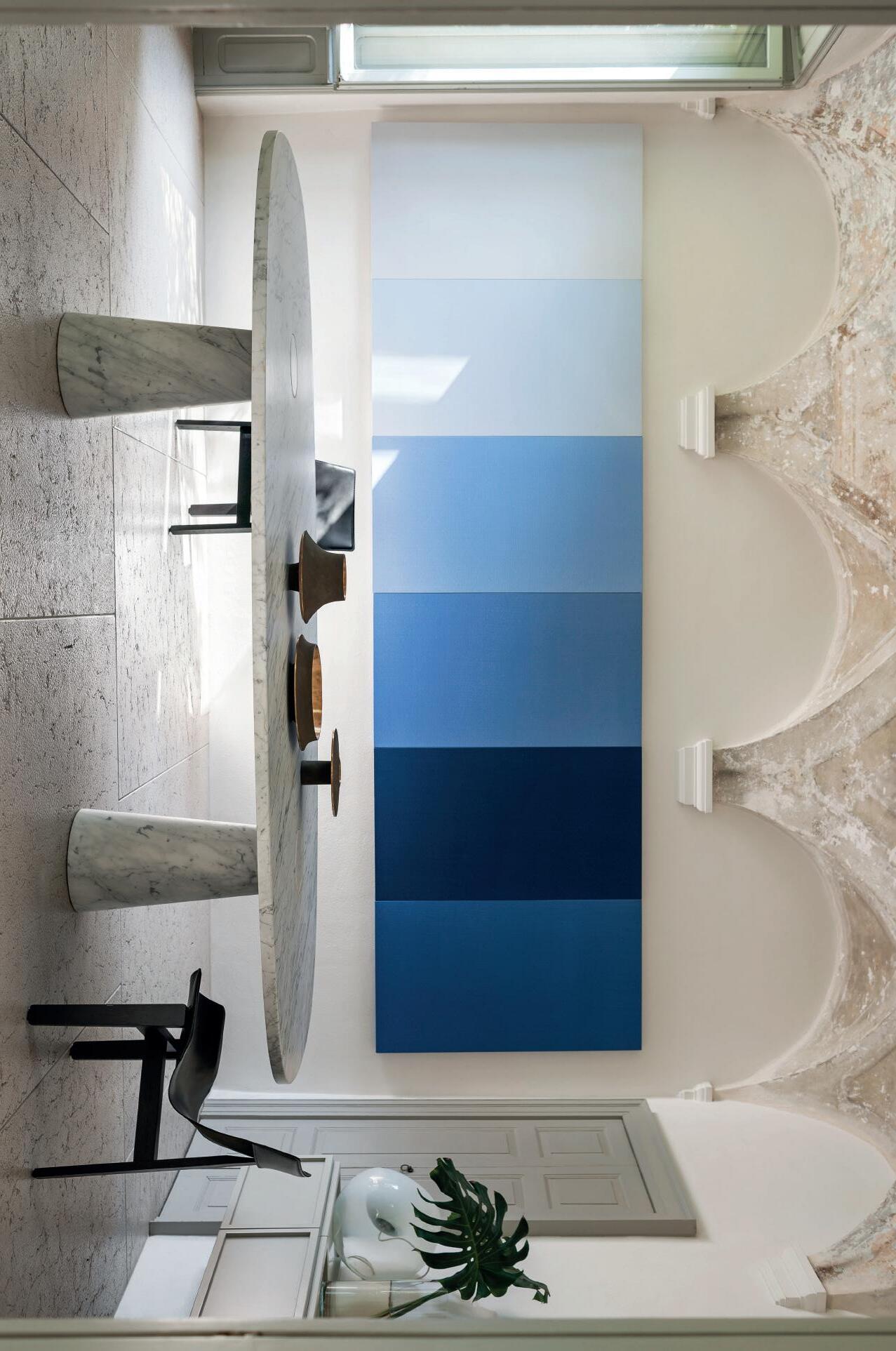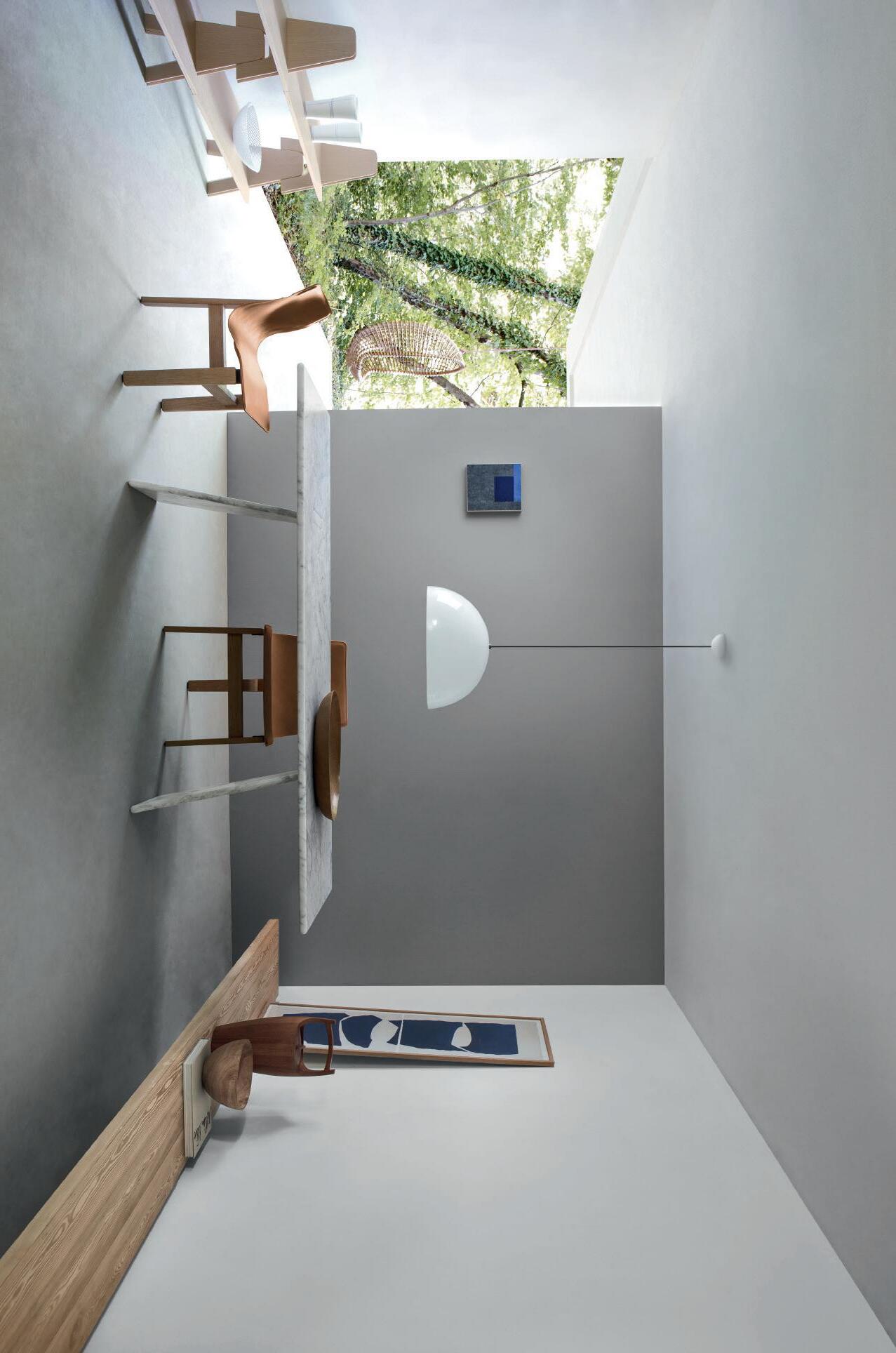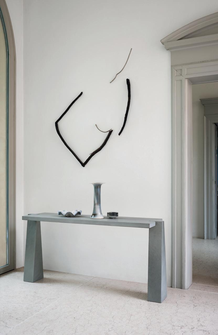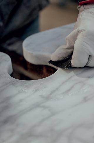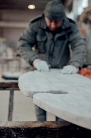 Pictures of how materials are handcrafted – hand polishing, smoothing wooden joints and stone elements. A very contemporary past that draws on Italian art and craftsmanship and brings them into the present.
