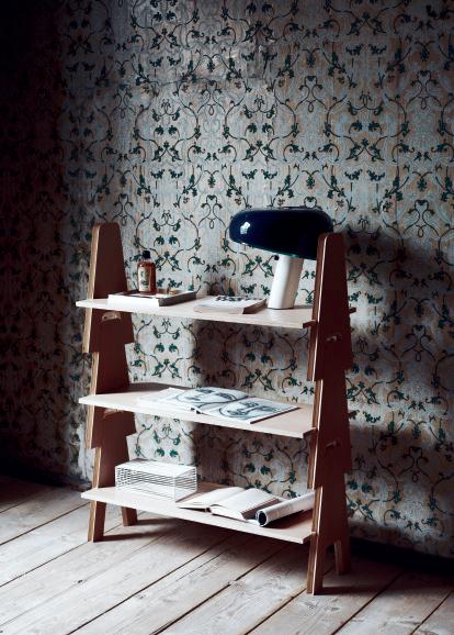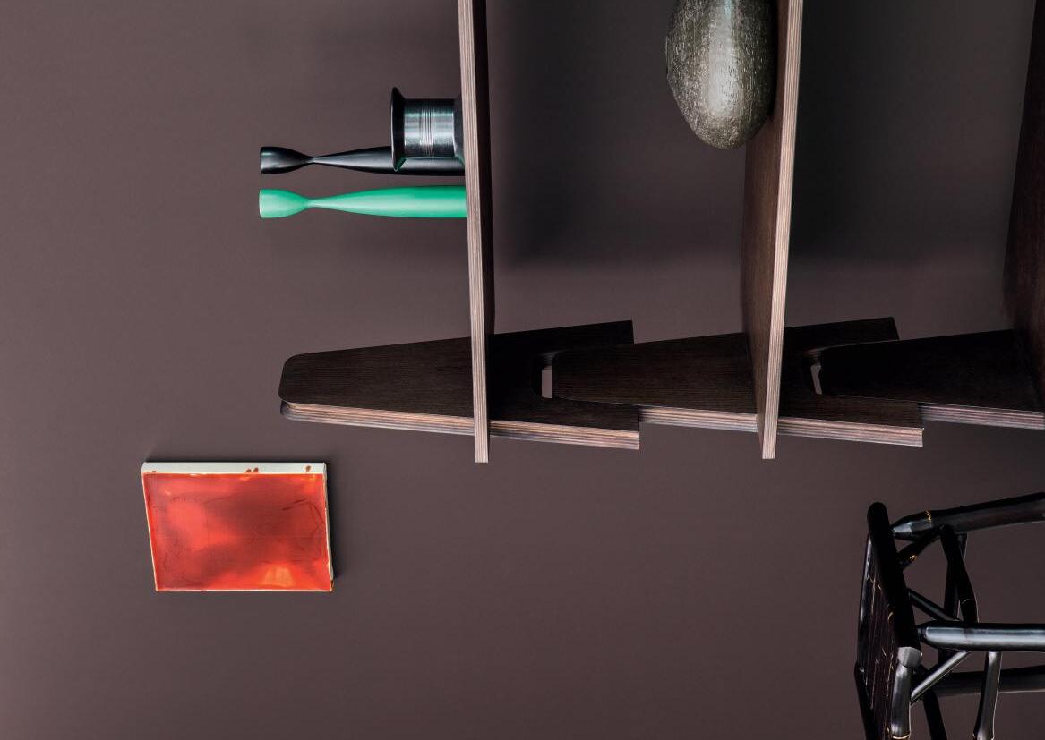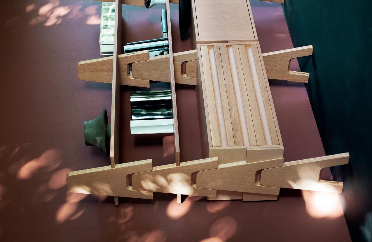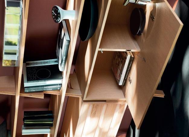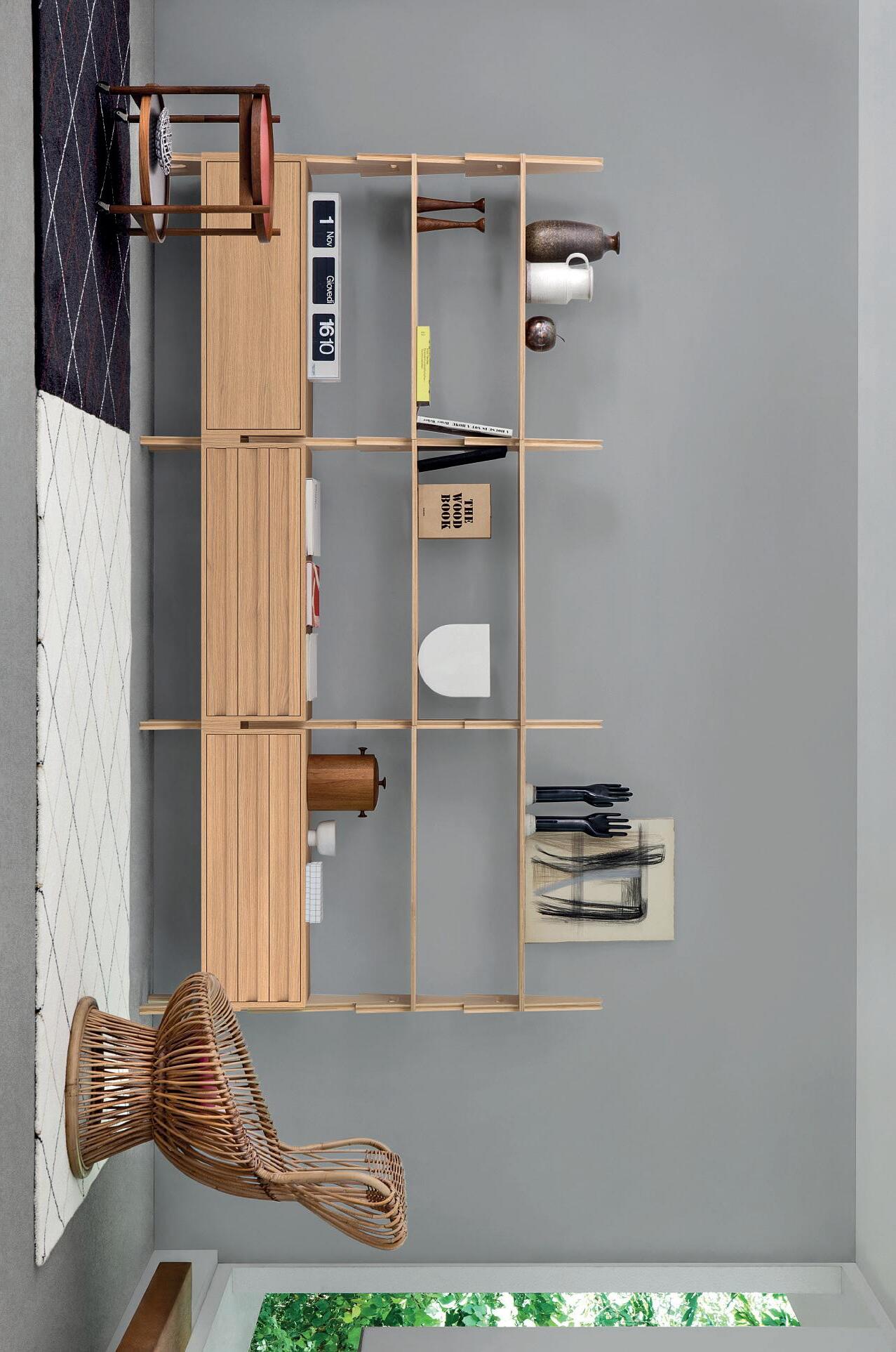 Programma componibile costituito da elementi verticali impilabili, ripiani e contenitori; realizzato in multistrati di betulla con finitura rovere naturale, bruno, scuro o mogano. Completano il sistema tavolini e daybed. Sono possibili composizioni a parete o ad isola. I contenitori, realizzati in multistrato di betulla, sono disponibili con anta a ribalta o con cassetti nella stessa finitura della cassa. Il daybed è completo di materasso e cuscino in tessuto. La panca è disponibile in due dimensioni ed è accessoriabile con cuscino in pelle nera composto da due parti simmetriche.