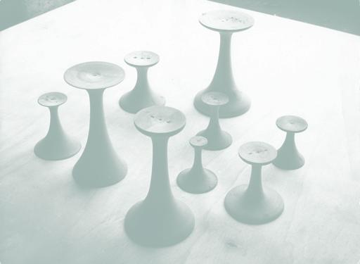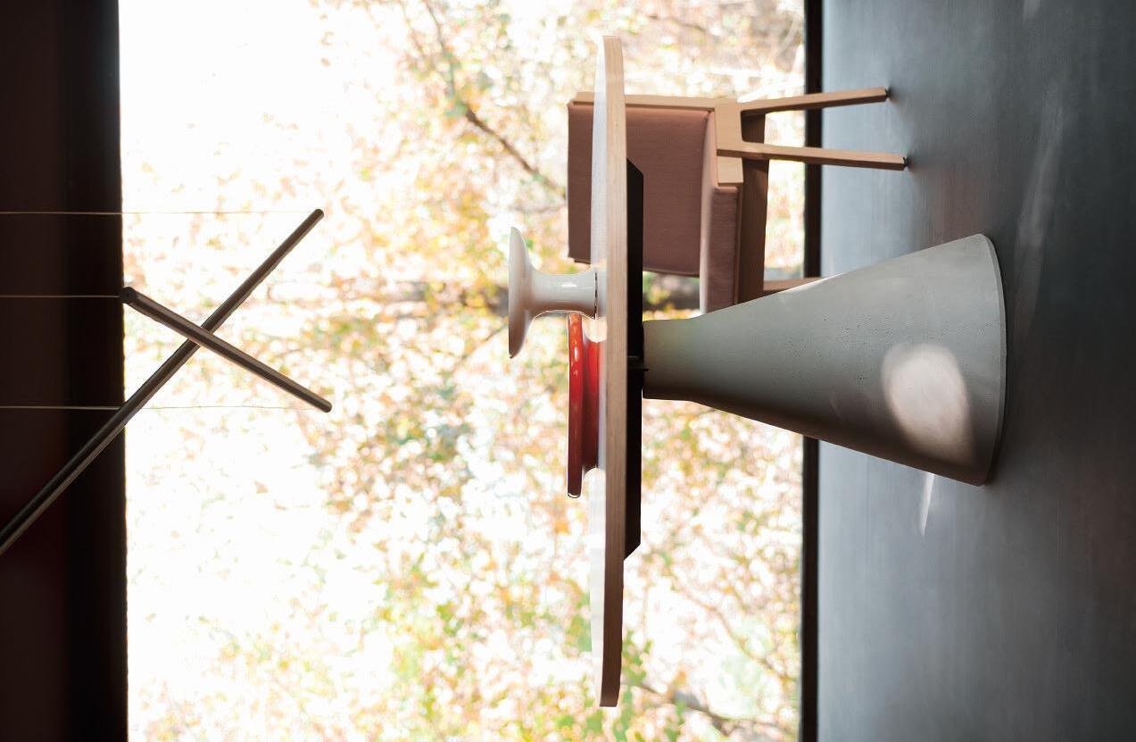 Un tavolo interamente in marmo che continua la ricerca sulle connessioni a gravità: in questo caso la particolare soluzione di un piano ellittico, inserito in modo asimmetrico in una gamba cilindrica inclinata, blocca per “eccentricità” (e non più per “conicità” come negli altri modelli) il suo movimento verticale, schiacciando con il proprio peso “a sbalzo” il giunto altrimenti scorrevole, e rendendolo per attrito un “incastro chiuso” a tutti gli effetti. Vero e proprio record costruttivo, il tavolo Eccentrico porta Angelo Mangiarotti verso i primati di alcuni grandi costruttori di mobili del Novecento, come il Franco Albini della libreria Veliero e il Carlo Mollino del tavolo Cremona: progetti che per i limiti a cui erano spinti hanno mostrato traguardi teorici mai raggiunti prima.