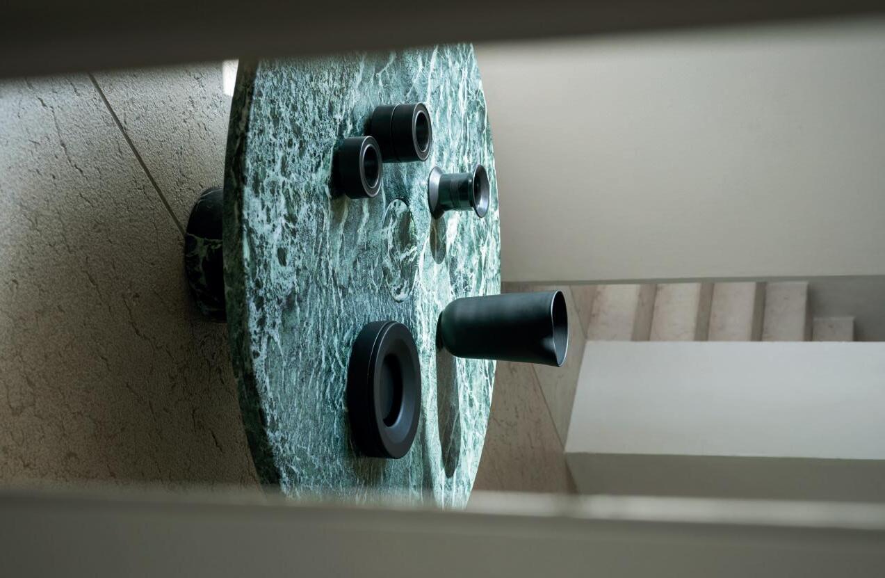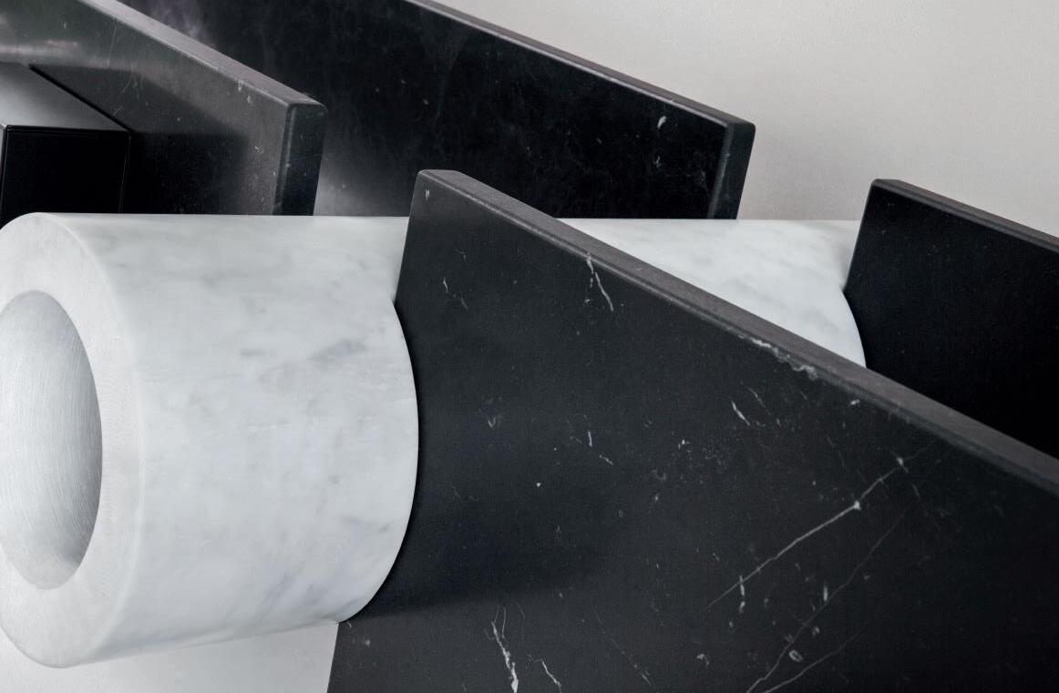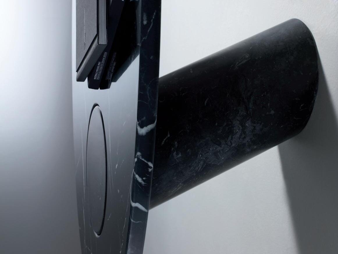 A scheme consisting of cylindrical, stackable weight-bearing elements and shelves which can be slotted in to create modular bookcases in adjustable height and length. In white Carrara marble, black Marquina marble, grey Carnico marble, green Alpi marble and Emperador dark marble.