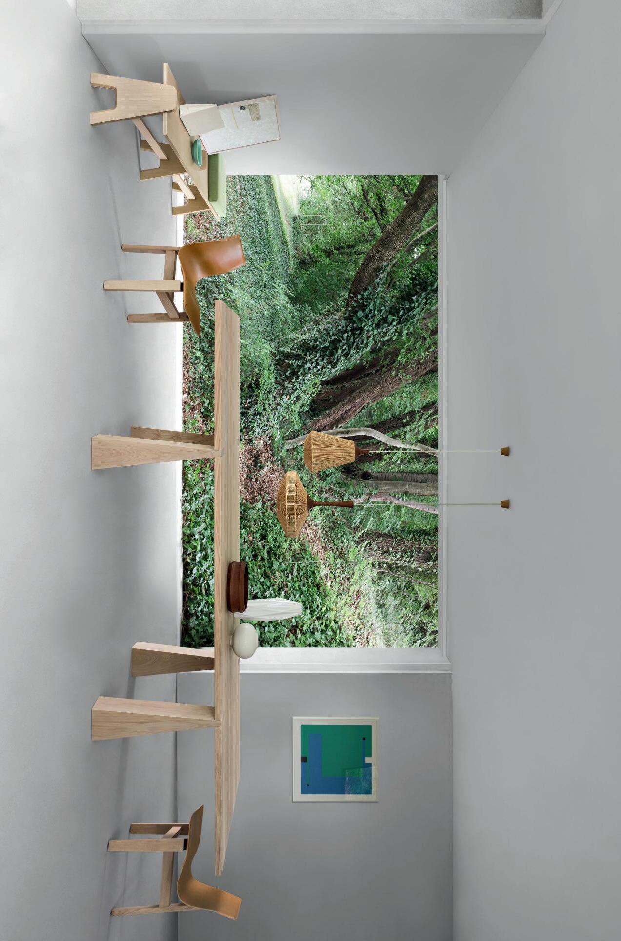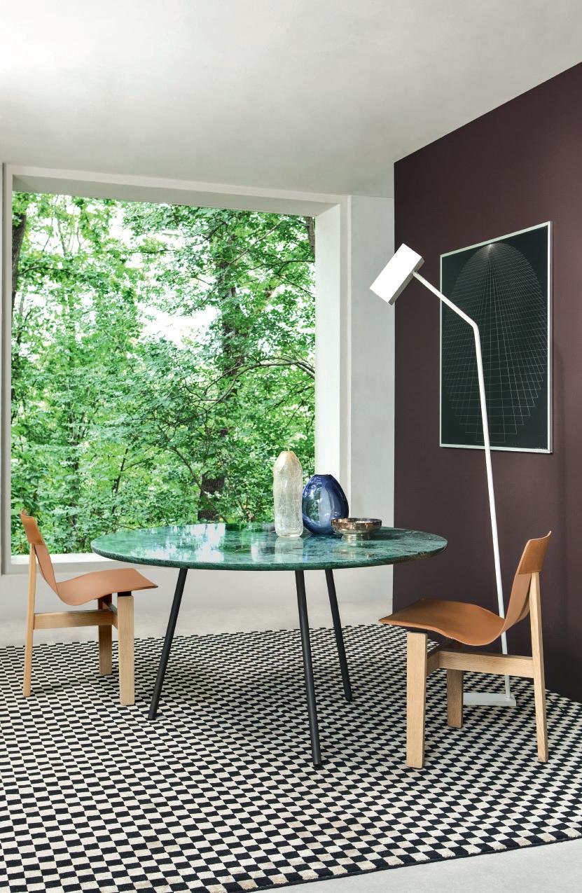 Sedia con struttura in rovere massello con finitura rovere naturale rovere bruno o rovere scuro e seduta in cuoio naturale, cuoio raw (cuoio naturale non pigmentato), verde o nero. Sviluppato e re-ingegnerizzato da Benedini Associati. Chair with a solid oak frame available in natural, brown or dark oak finish and natural, raw (non-pigmented leather), green or black leather seat. Developed and re-engineered by Benedini Associati.