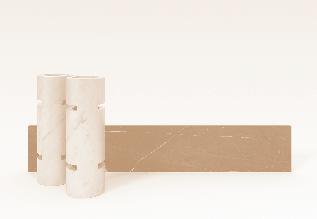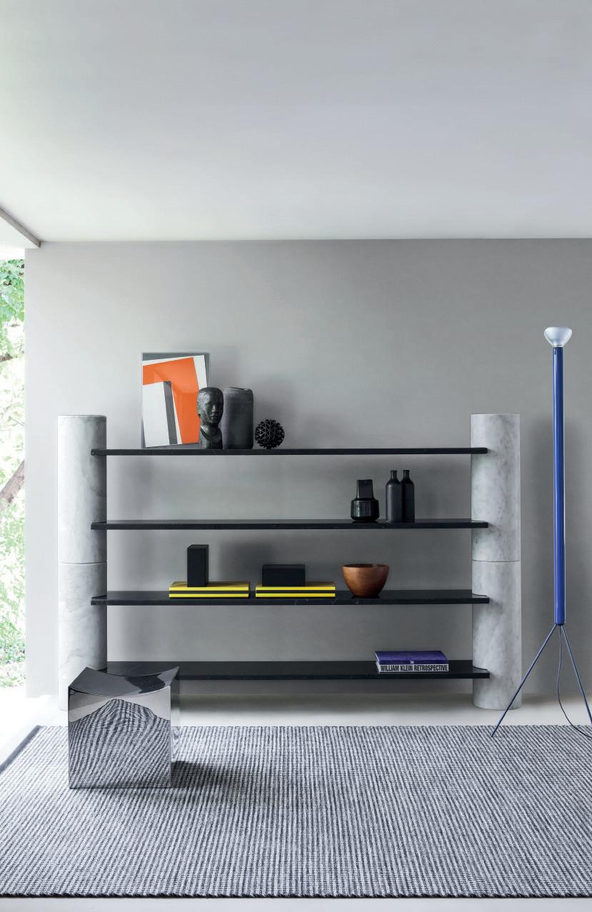 Programma formato da elementi portanti cilindrici e sovrapponibili e da ripiani che si fissano negli appositi incastri per realizzare librerie con misure modulari sia in altezza che in larghezza. Realizzato in marmo bianco di Carrara, marmo grigio Carnico, marmo nero Marquina, marmo verde Alpi o marmo Emperador dark.