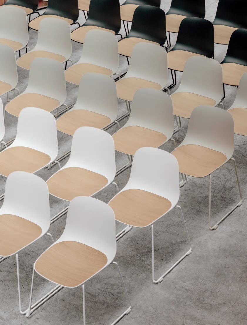 SEELA, qui con base a slitta impilabile, è una seduta ideale sia come postazione singola, sia moltiplicata per riempire grandi spazi come sale conferenza o auditorium. La base leggerissima e il design “nordico”, essenziale, consentono infatti di allinearla in lunghe file senza appesantire l’effetto d’insieme. La scocca in polipropilene è avvolgente e si apre senza soluzione di continuità nella seduta. L’inserto, integrato nella seduta e facilmente intercambiabile, permette di giocare con i materiali e con le cromie, dividendo le file della sala in settori diversi con effetti molto scenografici. Configurabile con accessori come la tavoletta e i braccioli, SEELA può essere rinnovata nel corso degli anni, mantenendo intatta nel tempo la sua minimale eleganza.