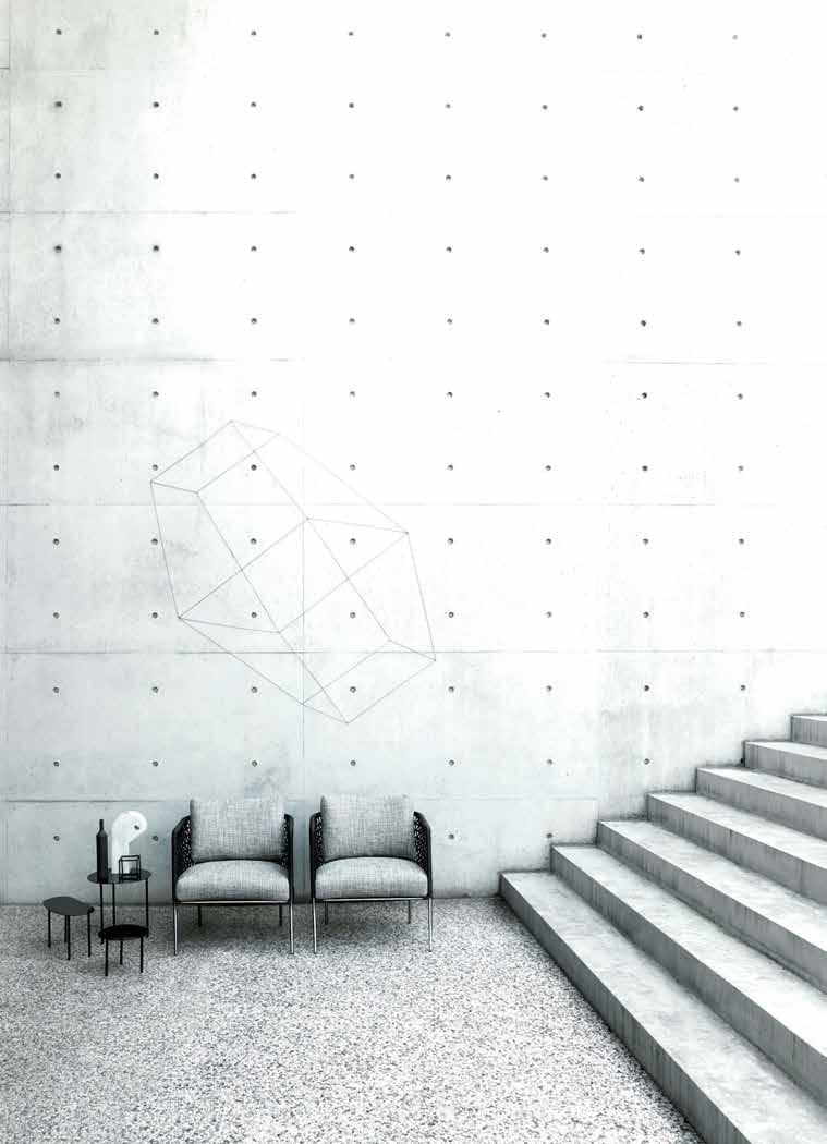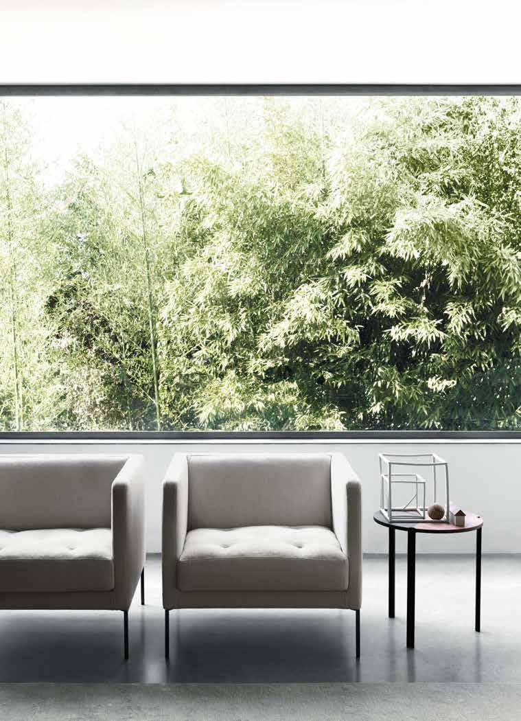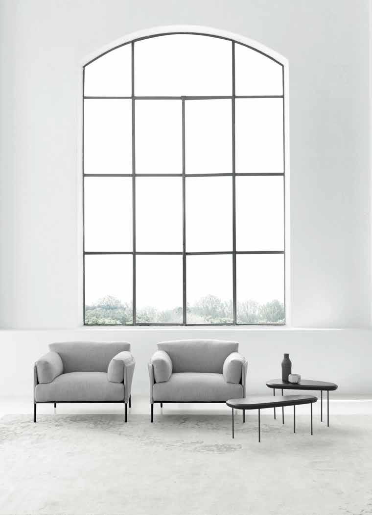 Rialzata su un sottile piedino, la poltrona Greene presenta una morbida scocca esterna che accoglie ampie cuscinature. Standing on slender feet, Greene armchair features a structured yet soft perimeter that welcomes ample cushions.