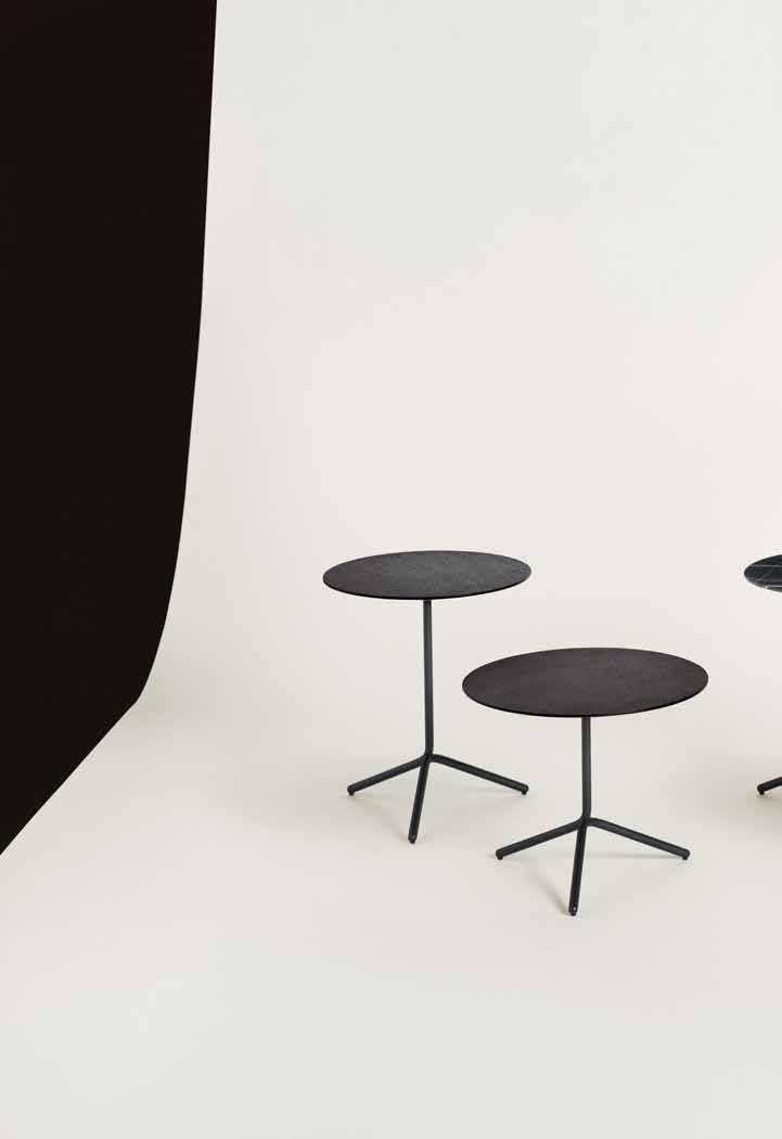 Sophisticated beauty of Notes tables with a rigid metallic structure of three slender legs whose appeal is enhanced by the charcoal-dyed colour of the wood tabletop.