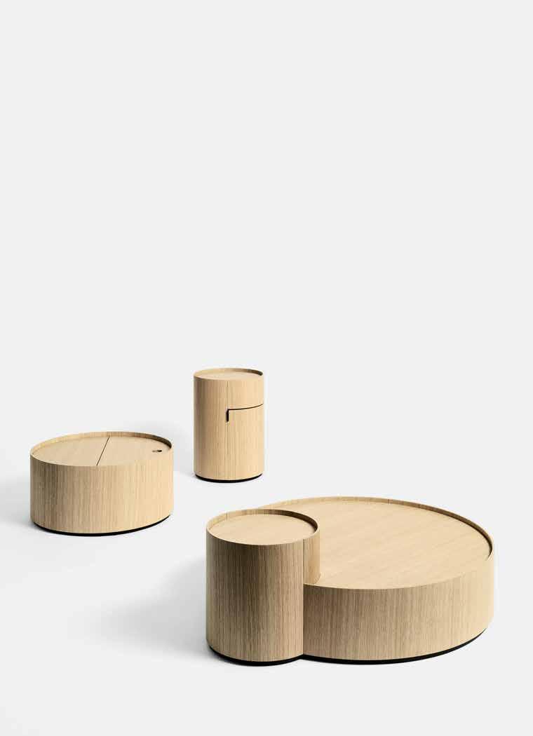 La forma pura in legno curvato, che si apre per rivelare vani contenitori, è caratterizzante nei tavolini Moon Coffee Table. The pure shape in curved wood, which opens to reveal storage compartments, characterizes in the Moon Coffee Table.
