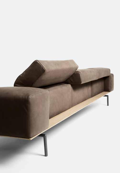 La forma affusolata ed essenziale del telaio, piacevolmente concavo e rialzato su piedini metallici, si contrappone alla parte imbottita, ampia ed accogliente del divano Sumo. The tapered and essential shape of the frame, pleasantly concave and raised on metal feet, is opposed to the large and welcoming padded elements of Sumo sofa.