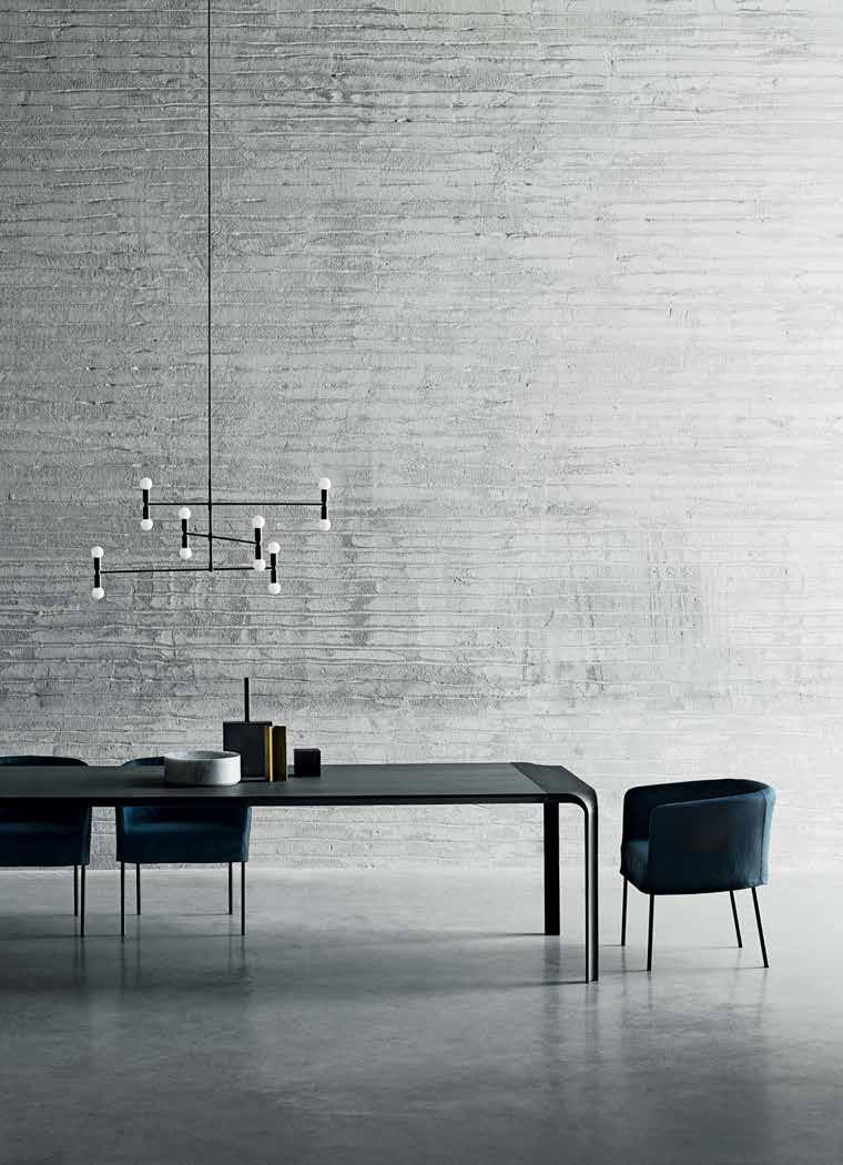 Ispirazione vintage, gioco di pieni e di vuoti, leggerezza visiva contraddistinguono le sedie Era con struttura verniciata canna di fucile e fascia poggiaschiena e seduta imbottite, per osare con i colori. Note rarefatte da disseminare liberamente in casa, omaggio al grande design del passato. A vintage inspiration, a balance of empty and full spaces and a visual lightness characterize Era chair with frame in gunmetal painted steel, padded backrest and seat, to dive with colors. Rarefied notes to be freely dispersed around in the house, homage to a great masters of the past.