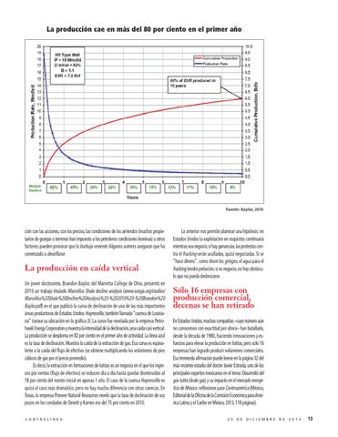 Sólo 16 empresas con producción comercial, decenas se han retirado En Estados Unidos, muchas compañías –cuyo número aún no conocemos con exactitud por ahora– han batallado, desde la década de 1980, haciendo innovaciones y esfuerzos para elevar la producción en lutitas, pero sólo 16 empresas han logrado producir volúmenes comerciales. Esa tremenda afirmación puede leerse en la página 32 del más reciente estudio del doctor Javier Estrada, uno de los principales expertos mexicanos en el tema: Desarrollo del gas lutita (shale gas) y su impacto en el mercado energético de México: reflexiones para Centroamérica (México, Editorial de la Oficina de la Comisión Económica para América Latina y el Caribe en México, 2013, 118 páginas). 23 DE DICIEMBRE DE 2013