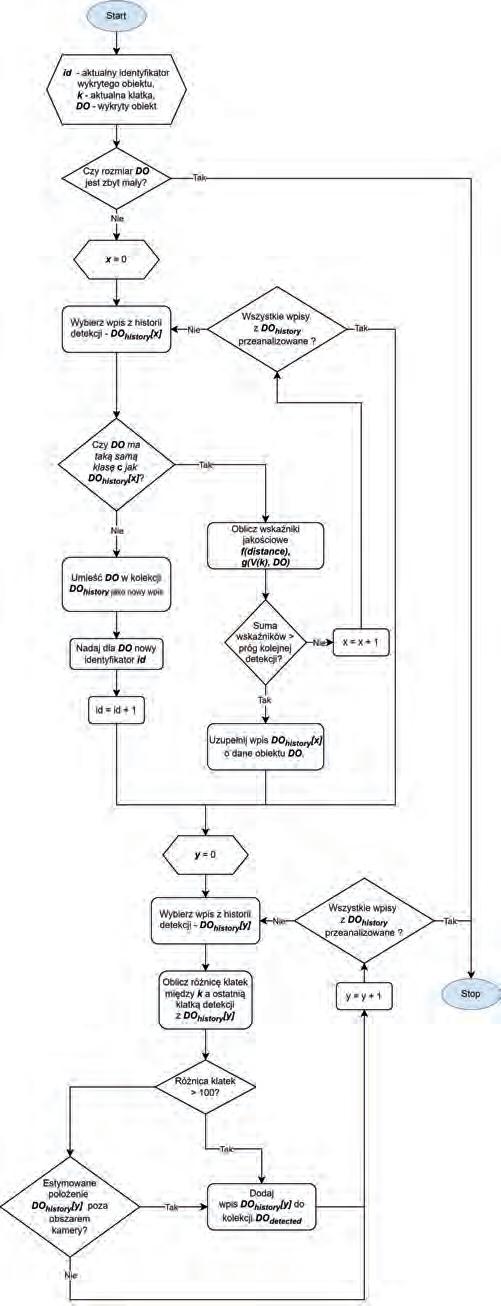 9. Dla wszystkich obiektów w DOhistory dla danej klatki k wykonywany jest następujący algorytm: (1) Obliczana jest różnica między klatką k a ostatnią klatką detekcji DOhistory[x]; (2) Obliczane jest estymowane położenie obiektu DOhistory[x]; Jeżeli z obliczeń wyniknie, że obiekt znajdzie się poza obszarem rejestrowanym przez kamerę, to dany obiekt DOhistory[x] jest przenoszony do listy wykrytych i zakończonych detekcji DOdetected