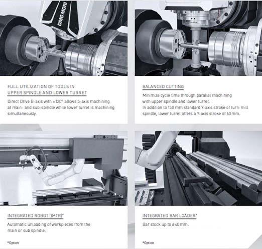 • Prelucrare în 4 axe simultană prin ax-ul principal de strunjire-frezare cu turelă inferioară cu 16 buzunare BMT 42/64 cu 12.000 min-1