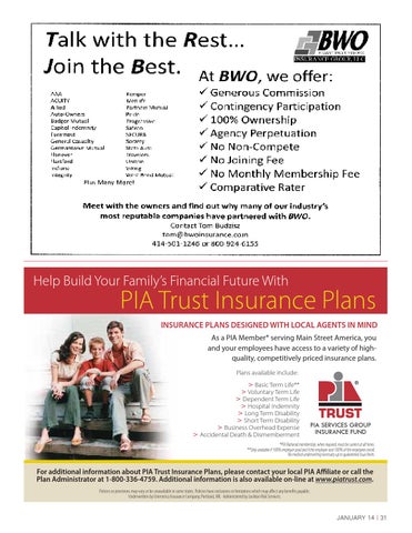 PIA Trust Insurance Plans INSURANCE PLANS DESIGNED WITH LOCAL AGENTS IN MIND As a PIA Member* serving Main Street America, you and your employees have access to a variety of highquality, competitively priced insurance plans. Plans available include: > Basic Term Life** > Voluntary Term Life > Dependent Term Life > Hospital Indemnity > Long Term Disability > Short Term Disability > Business Overhead Expense > Accidental Death & Dismemberment