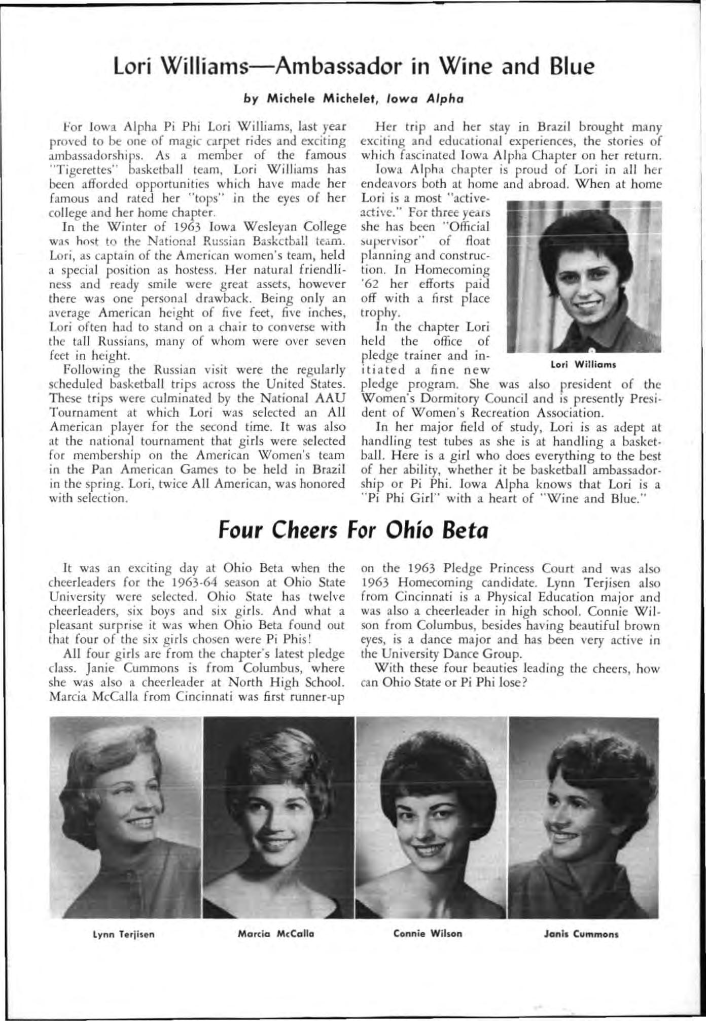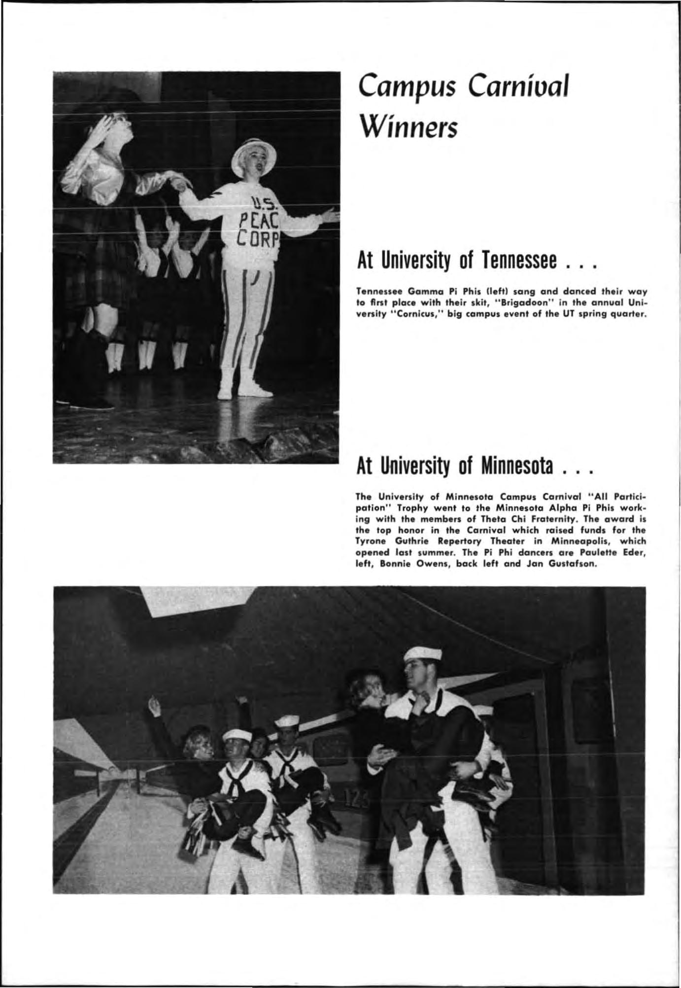 Attending the banquet as g uests were Mi ss Cathe rine Murphy , Sally Rin g le H otchki ss and Joseph ine Phelps White all Virg ini a Alpha alumn., and Ali ce Arnold Th elen , Nebraska Beta Out of our pledge class of thirty , eight remain: Susan Payne, Ka re n Brill , Elizabeth Bundell, Karen Th o renso n, Ann Trous· dale , Suzy Williams , Dee Blakemore and Susan Ri ch ey.