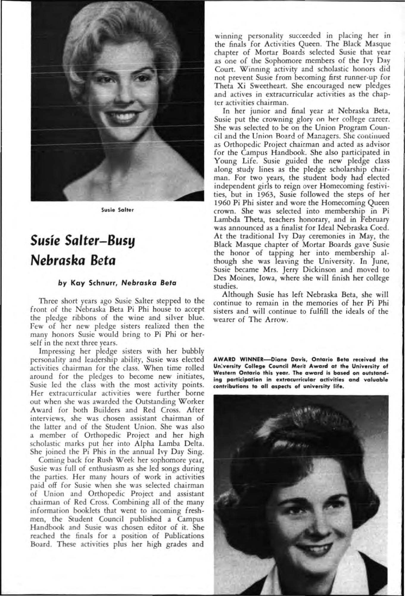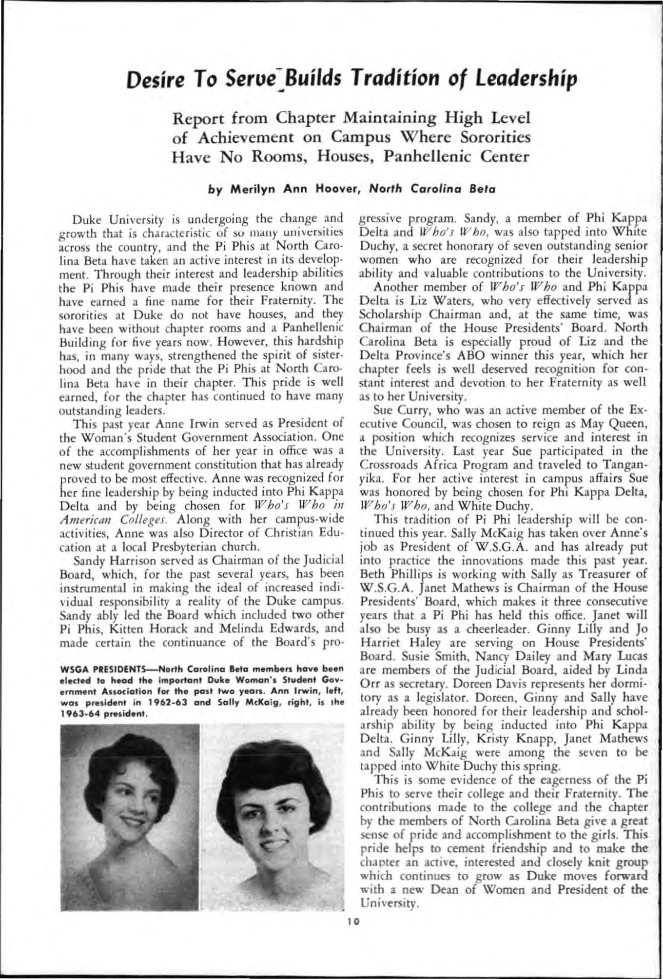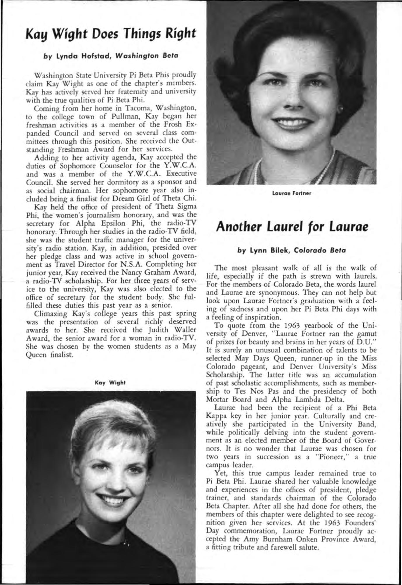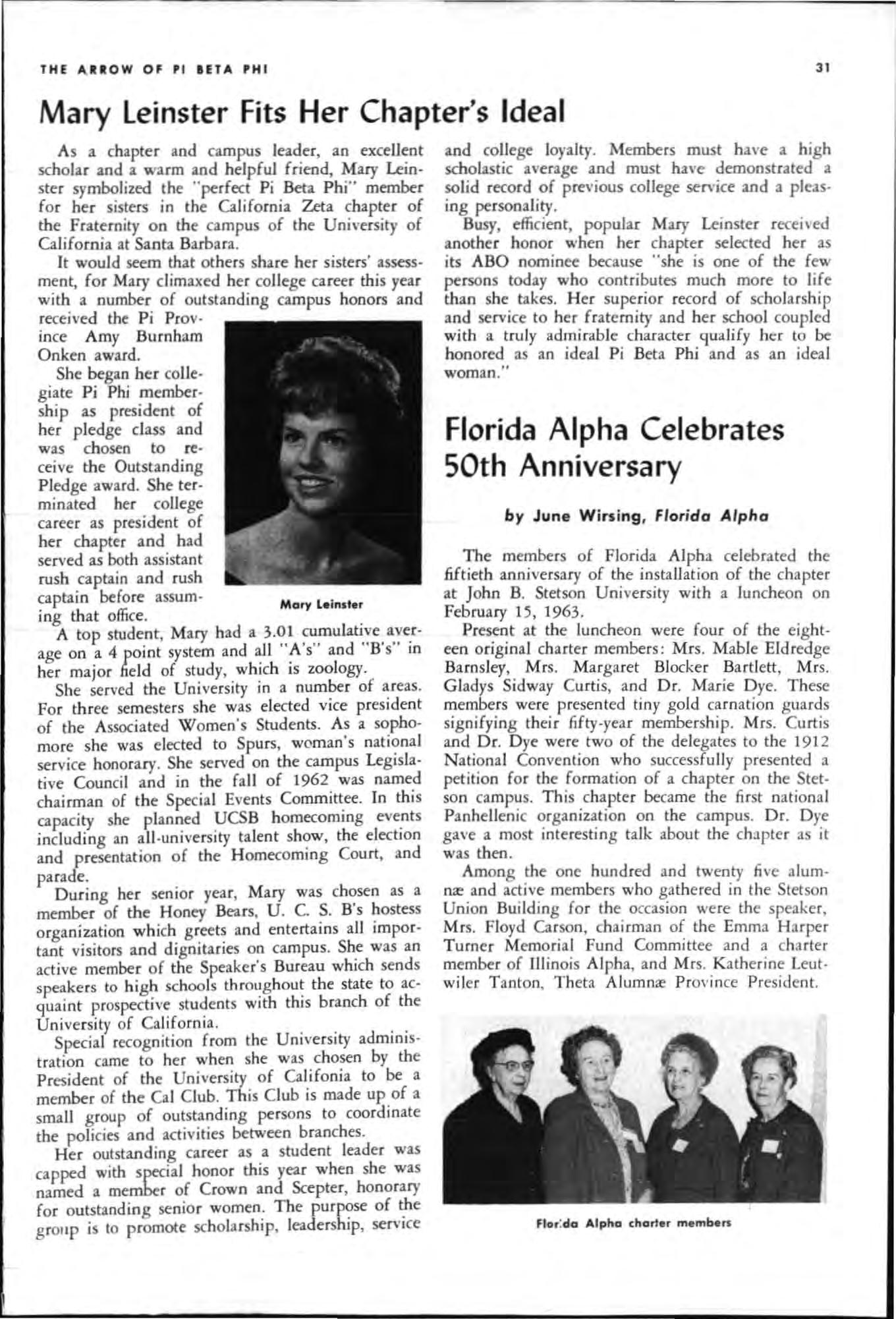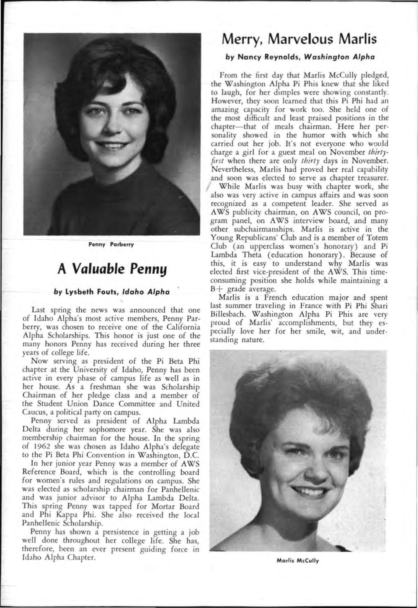 Both young women had served their charters as president and both had demonstrated unusua abi li ty in I;'romoting chapter spirit and unity, in the areas of Individual responsibility and initiative and had led their chapters to hi g he r lev els of accomp li s hment during the yea c.
