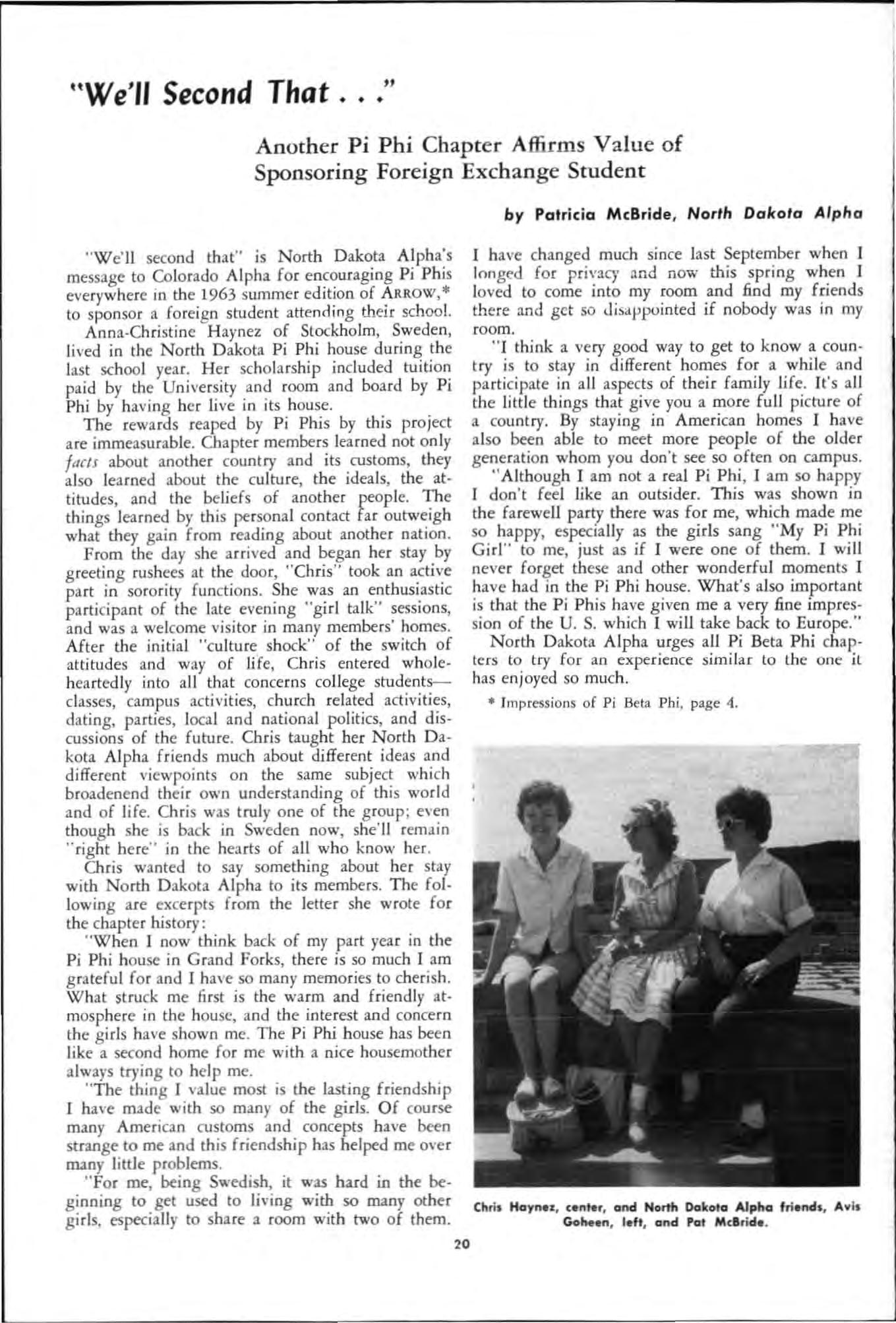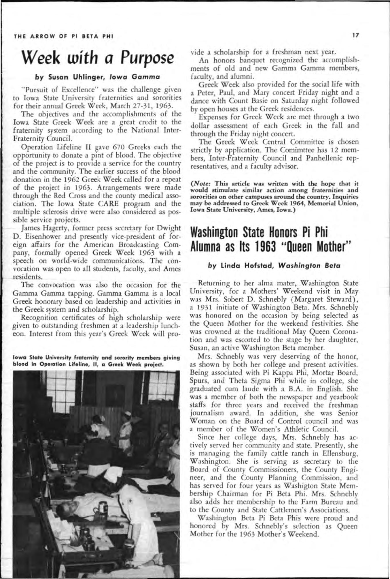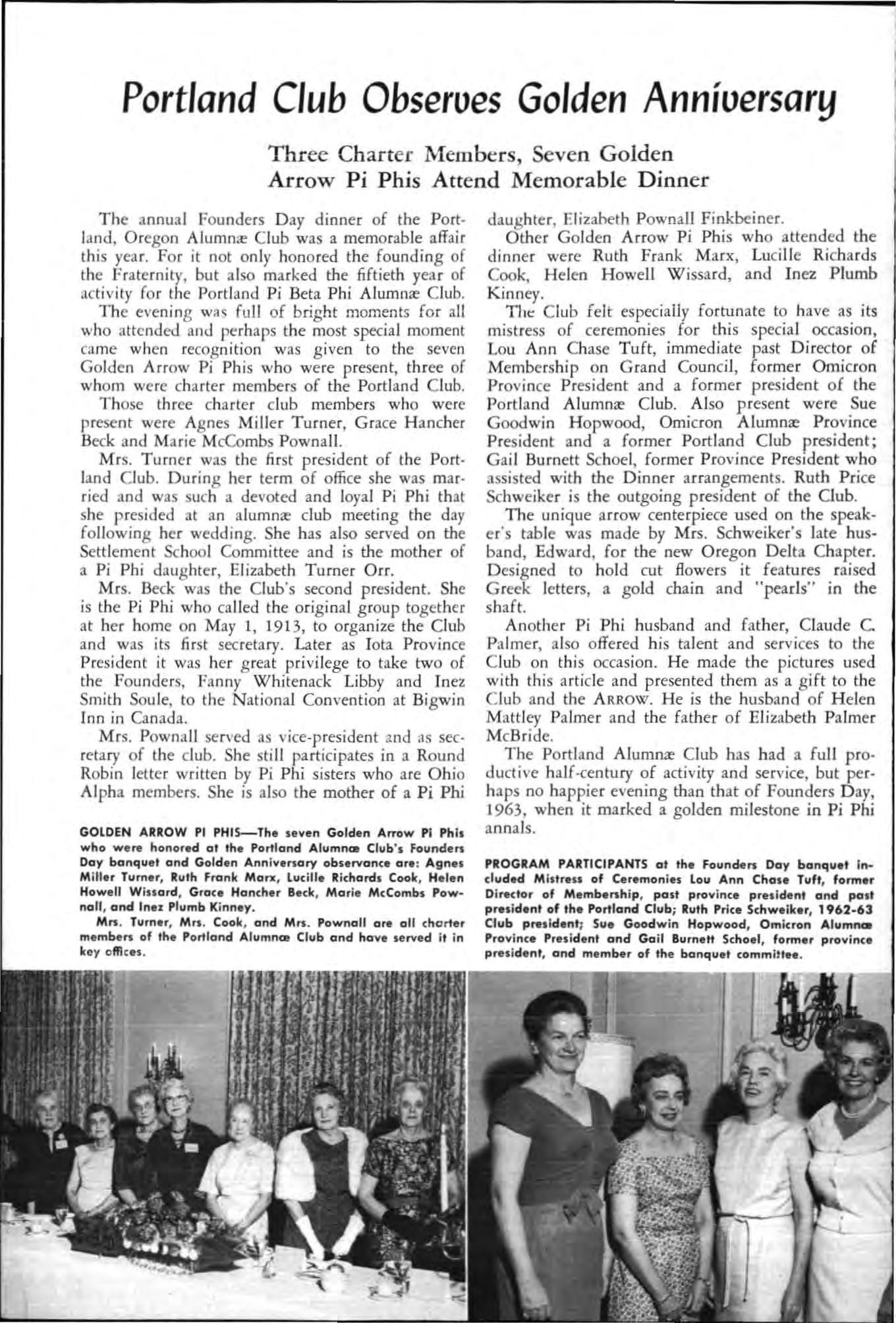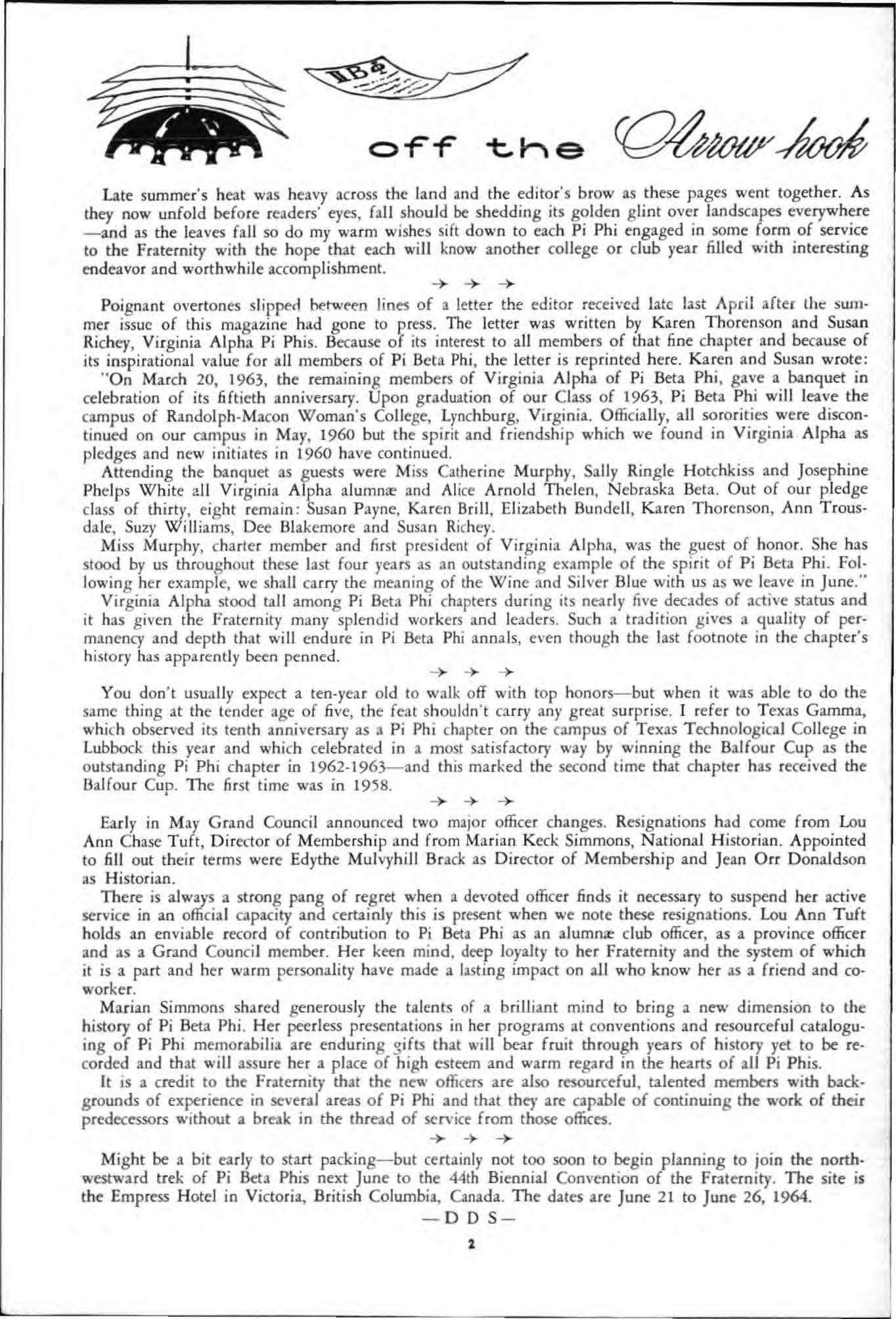 Poi g nant overtones slipped between lines of a letter the editor re ce ived lat e la st April after lhe summec iss ue of this magazine had gone to press The letter was written by Karen Thorenson and Susan Ri chey , Virginia Alpha Pi Phis Because of its int erest to all members of that fine chapter and because of its inspirational value for all members of Pi Beta Phi, the letter is reprinted here. Karen and Susan wrote : " On March 20, 1963, the remainin g members of Virgini a Alpha of Pi Beta Phi , gave a banquet in celebration of its fiftieth anniversary. Upon g raduati o n of our Class of 1963, Pi Beta Ph i will leave the camp us of Rando lph . Macon Woman's College, Lyn chburg, Virgi n ia. Officially, all sororities were discon· tinued o n our campus in Ma y, 1960 but the spi rit and friendship which we found in V i rg inia Alpha as pledges an d new initiates in 1960 h ave co ntinu ed.