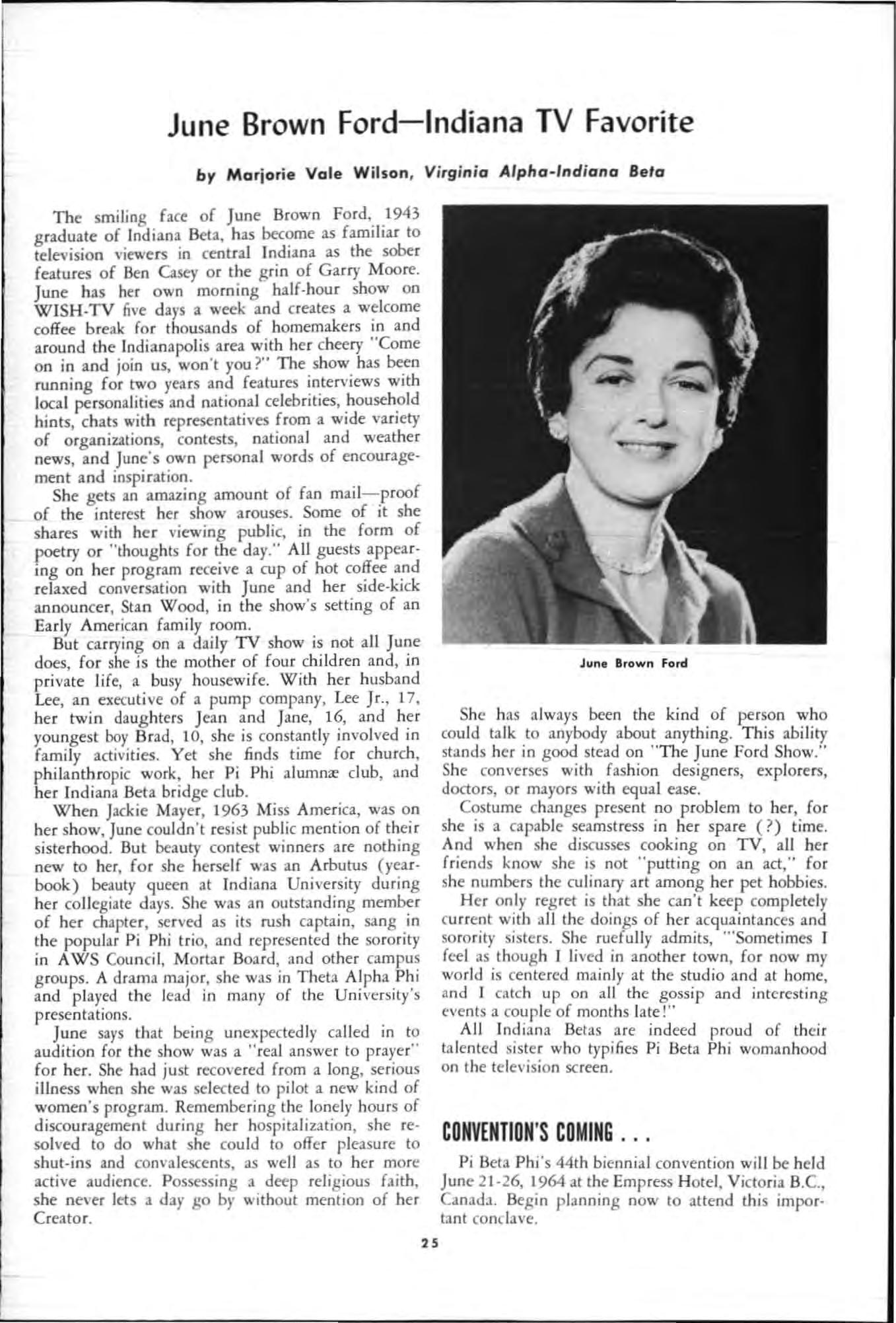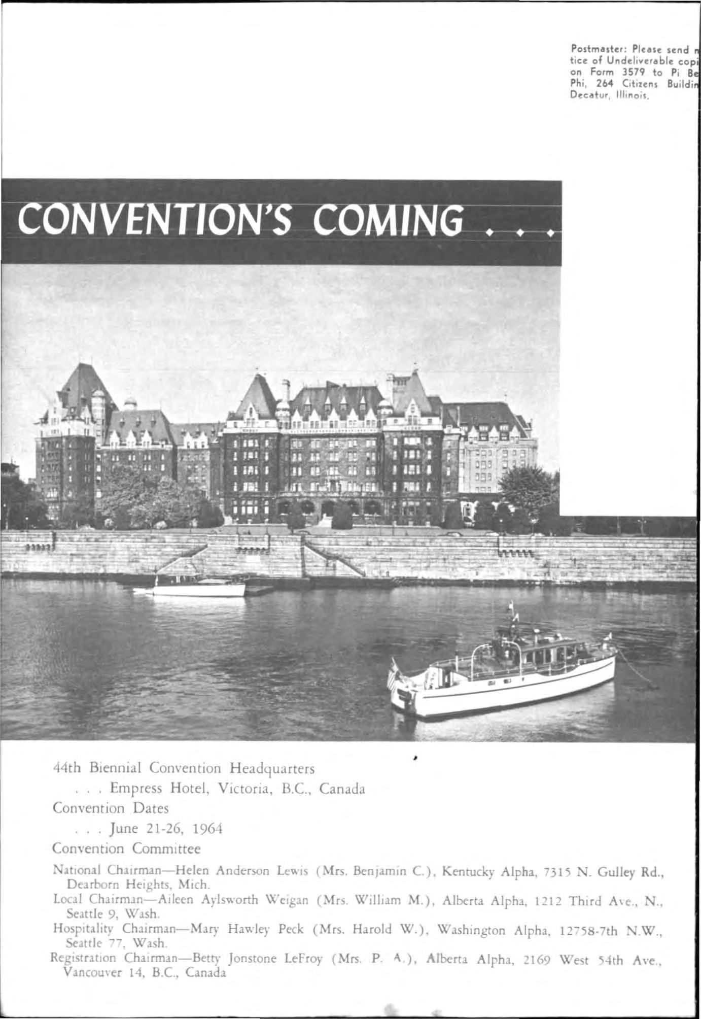 Mi g ht be a bit early to start packing-but certain ly not too soon to begin planning to join the northwestward trek of Pi Beta Phis next June to the 44th Biennial Convention of the Fraternity. The site is the Empress H otel in Victoria , Briti sh Columbia, Canada. The dates are June 21 to June 26, 1964