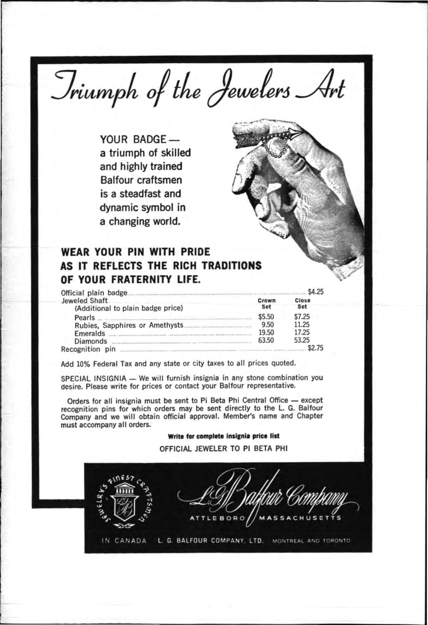 Orders for all inSignia must be sent to Pi Beta Phi Central Office - except recognition pins for which orders may be sent directly to the L. G Balfour Company and we wi ll obta i n offICial approval. Member'S name and Chapter must accompany all orders , Wri ll to< pl ol. Inll,n l pric. lilt